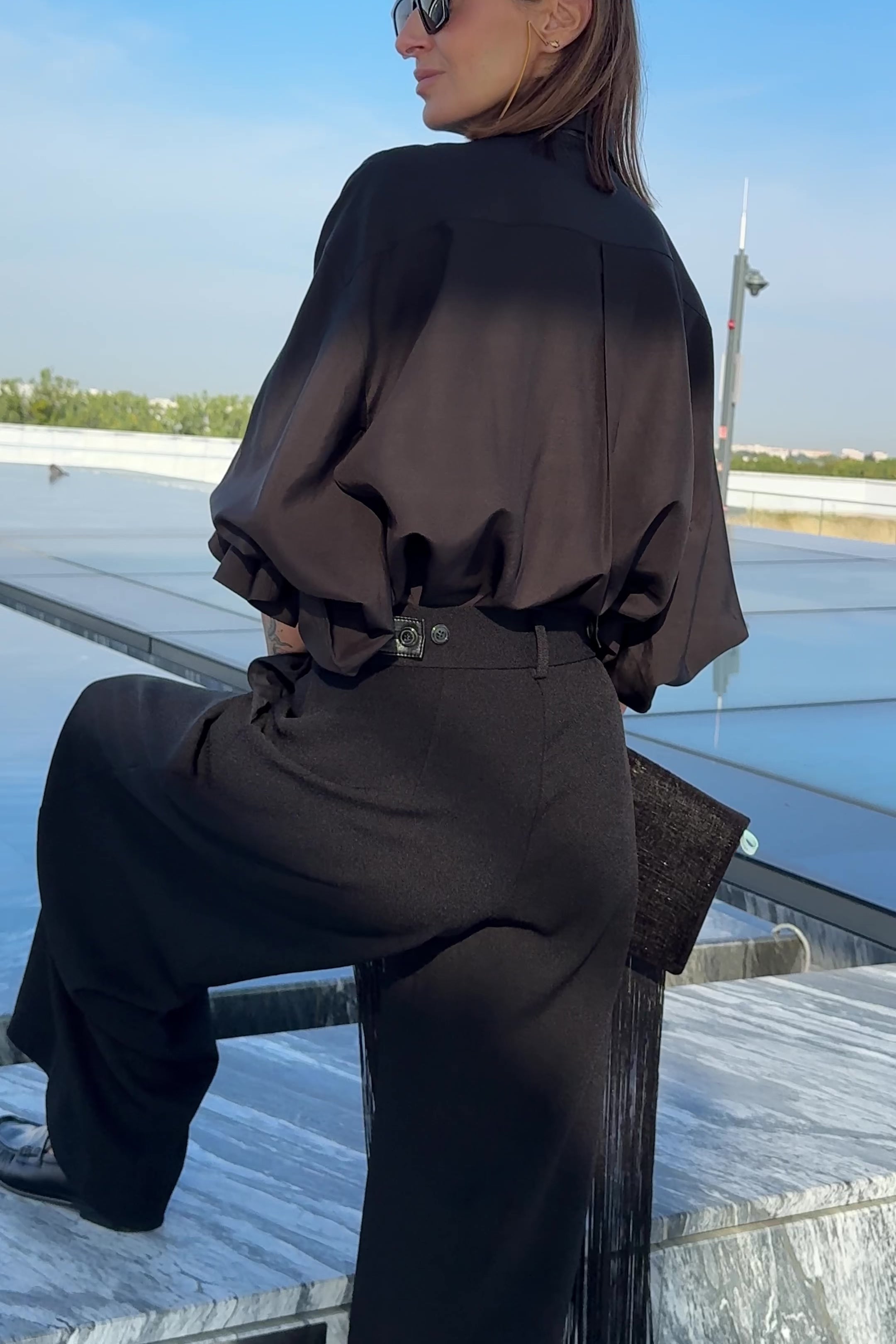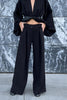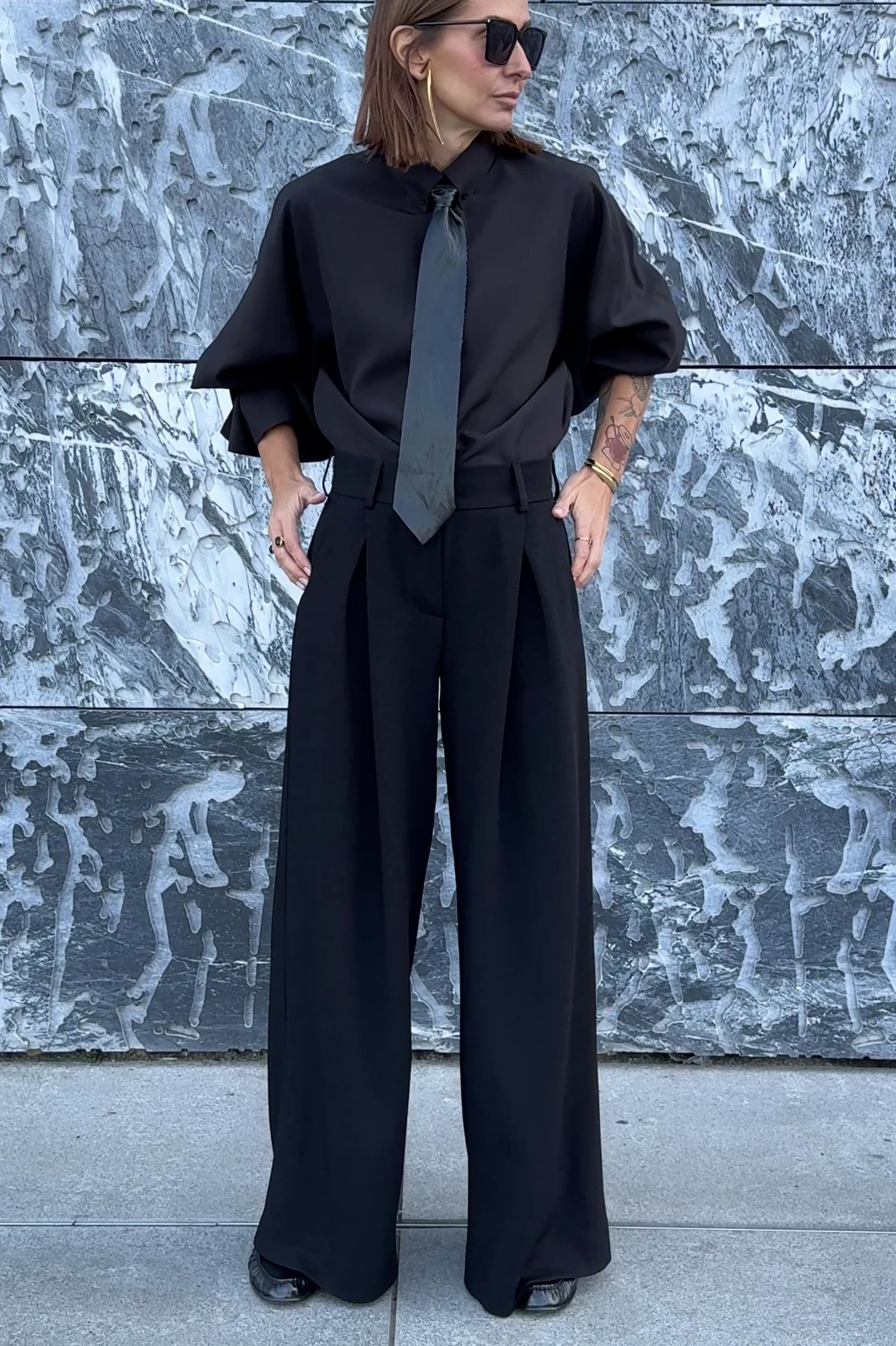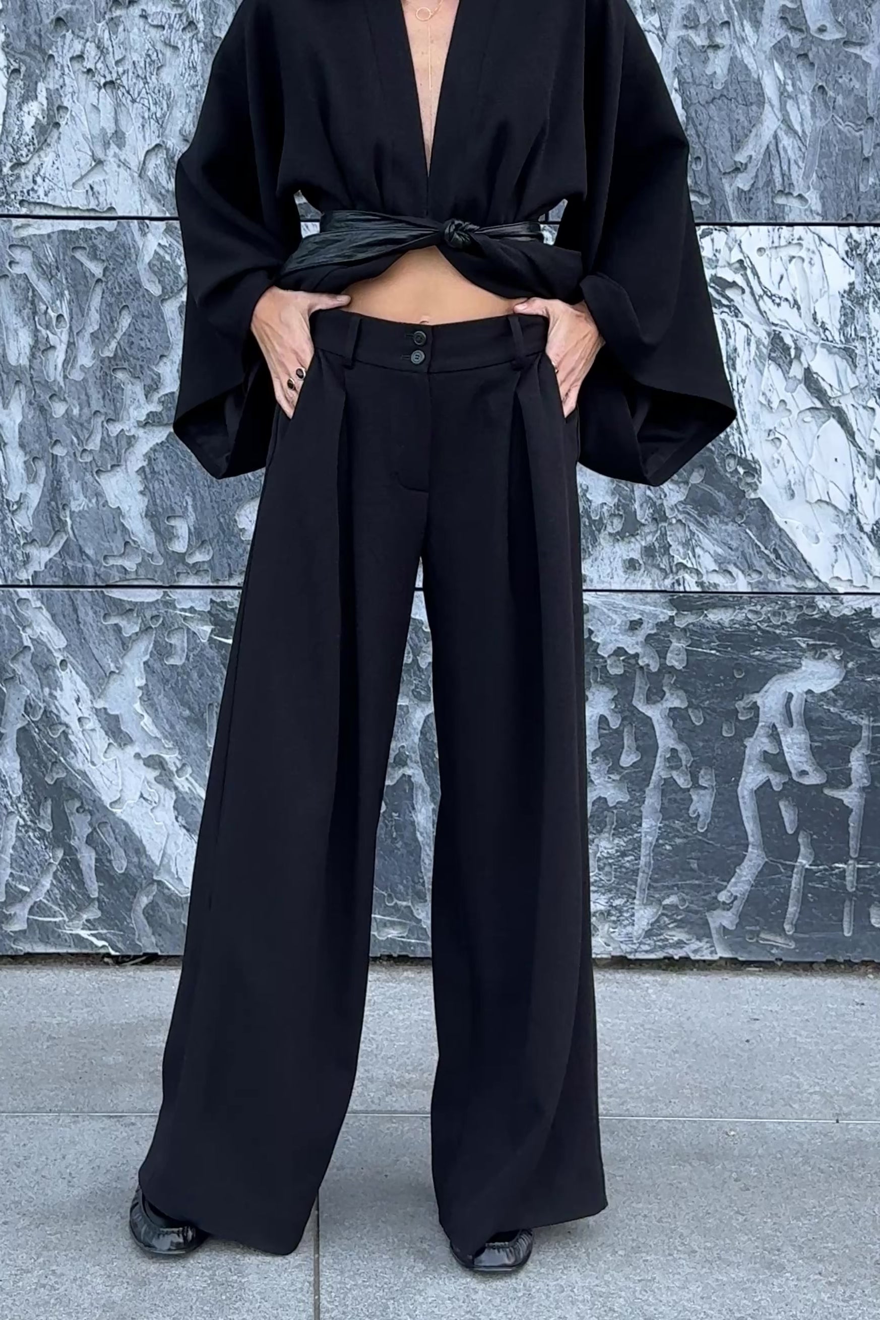 Krój prostych, szerokich nogawek uzupełniają kontrafałdy, które – w odróżnieniu od klasycznych zakładek – nie dodają objętości, lecz wydłużają linię nogi i układają się wyjątkowo elegancko.