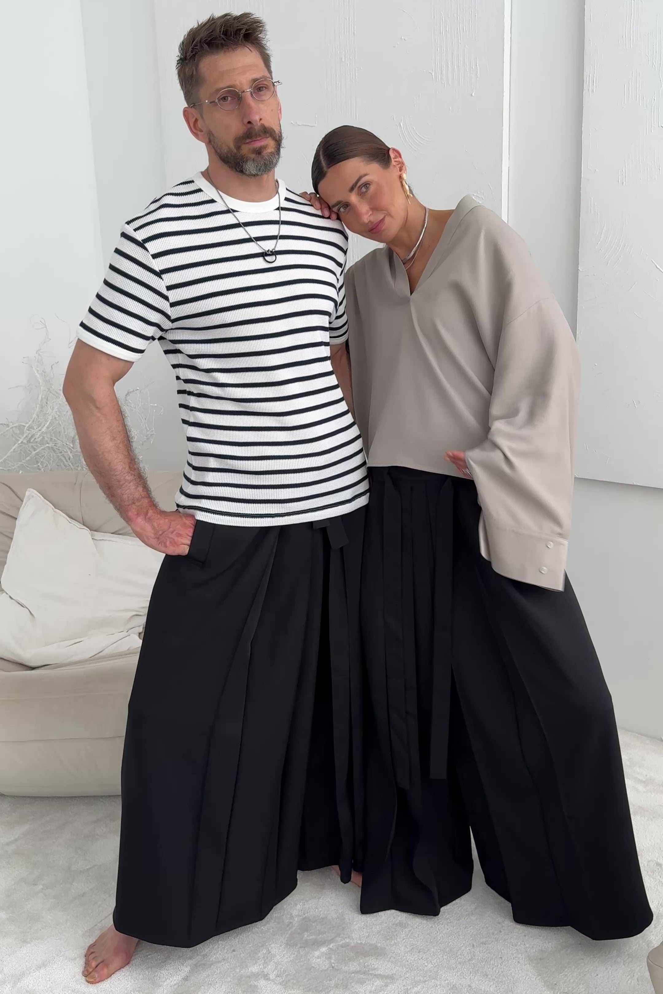 Tradycyjne japońskie hakamy w nowej, wydłużonej wersji – z węższymi, ale dłuższymi nogawkami.