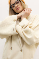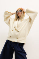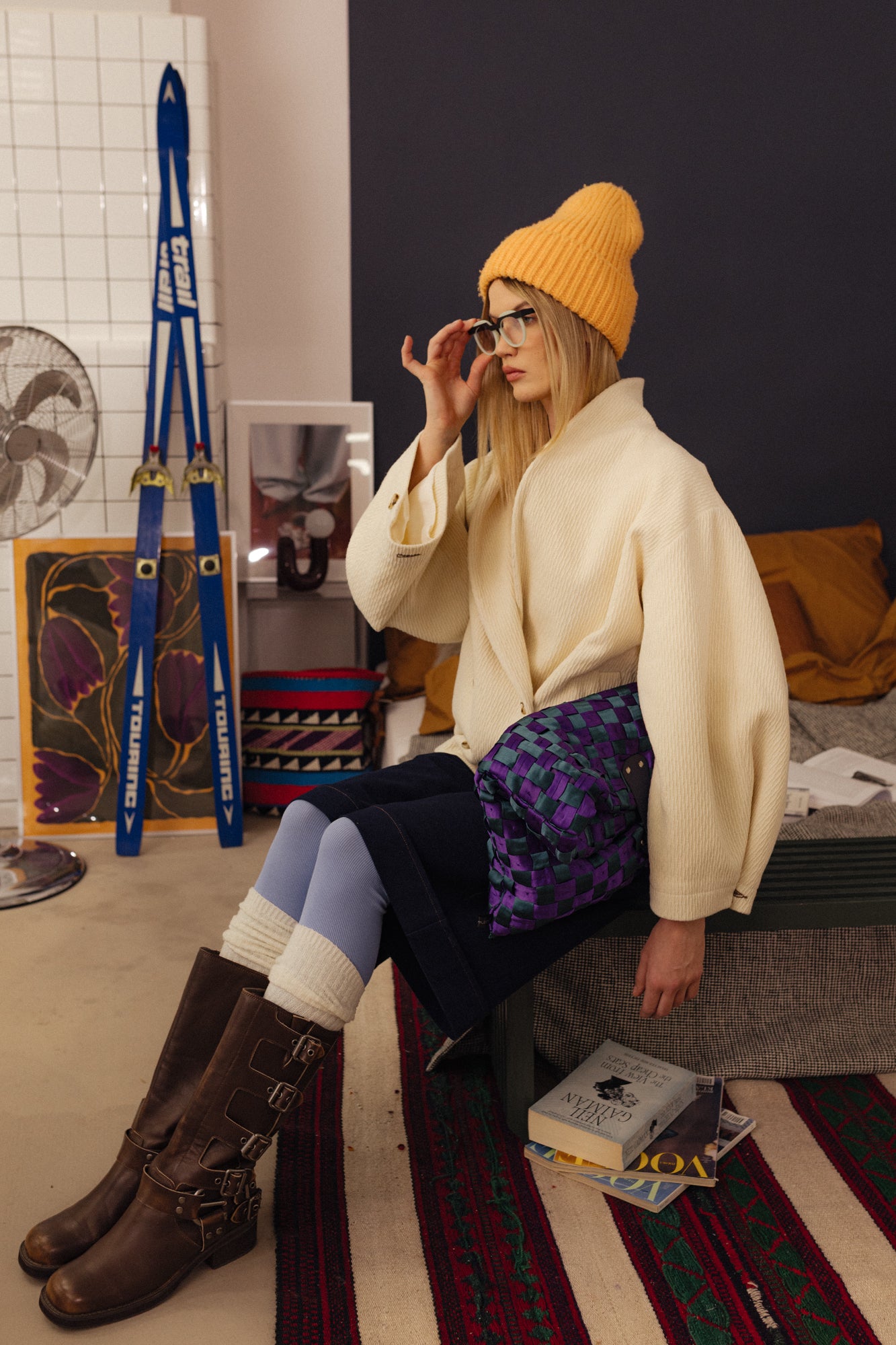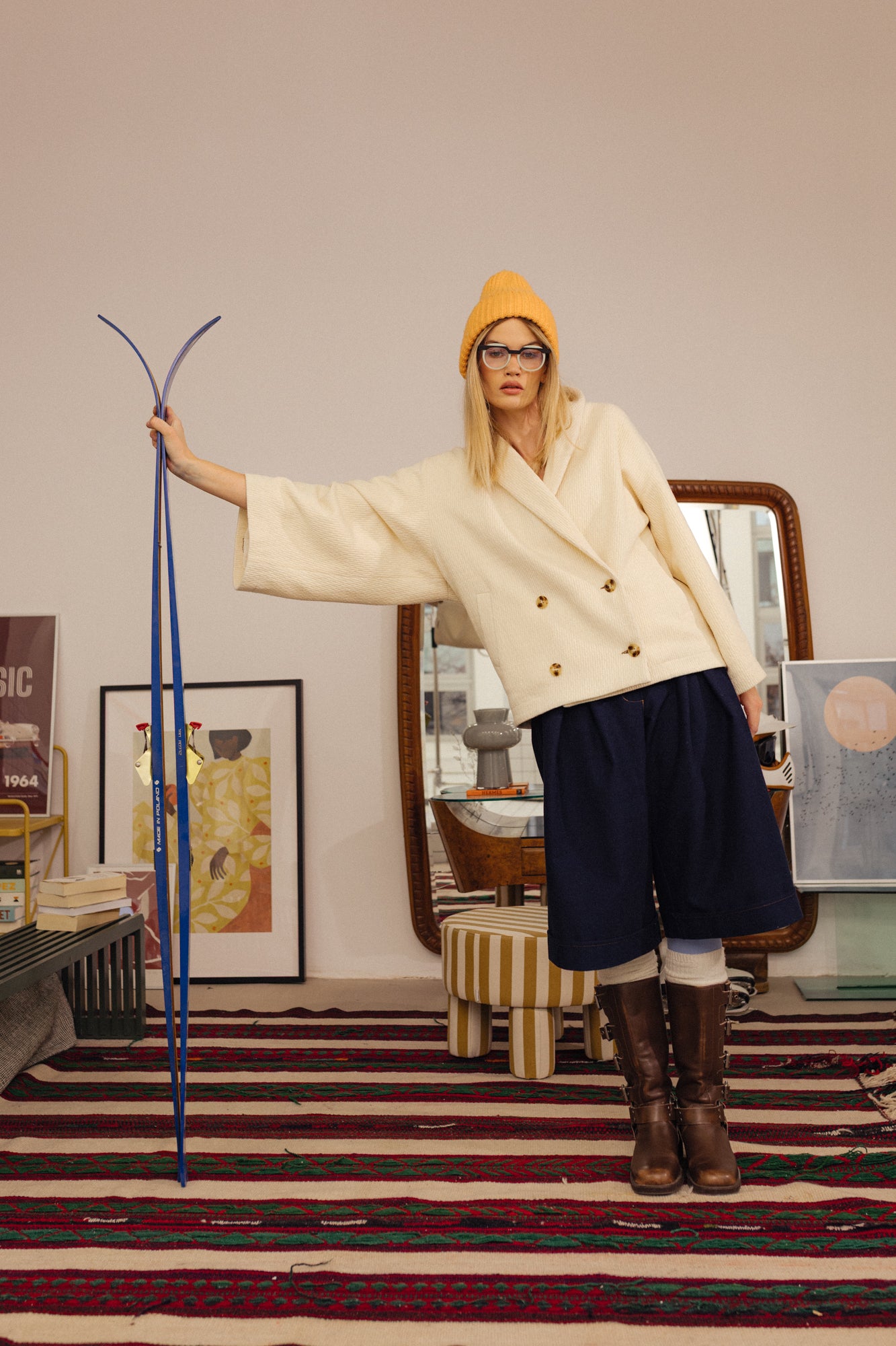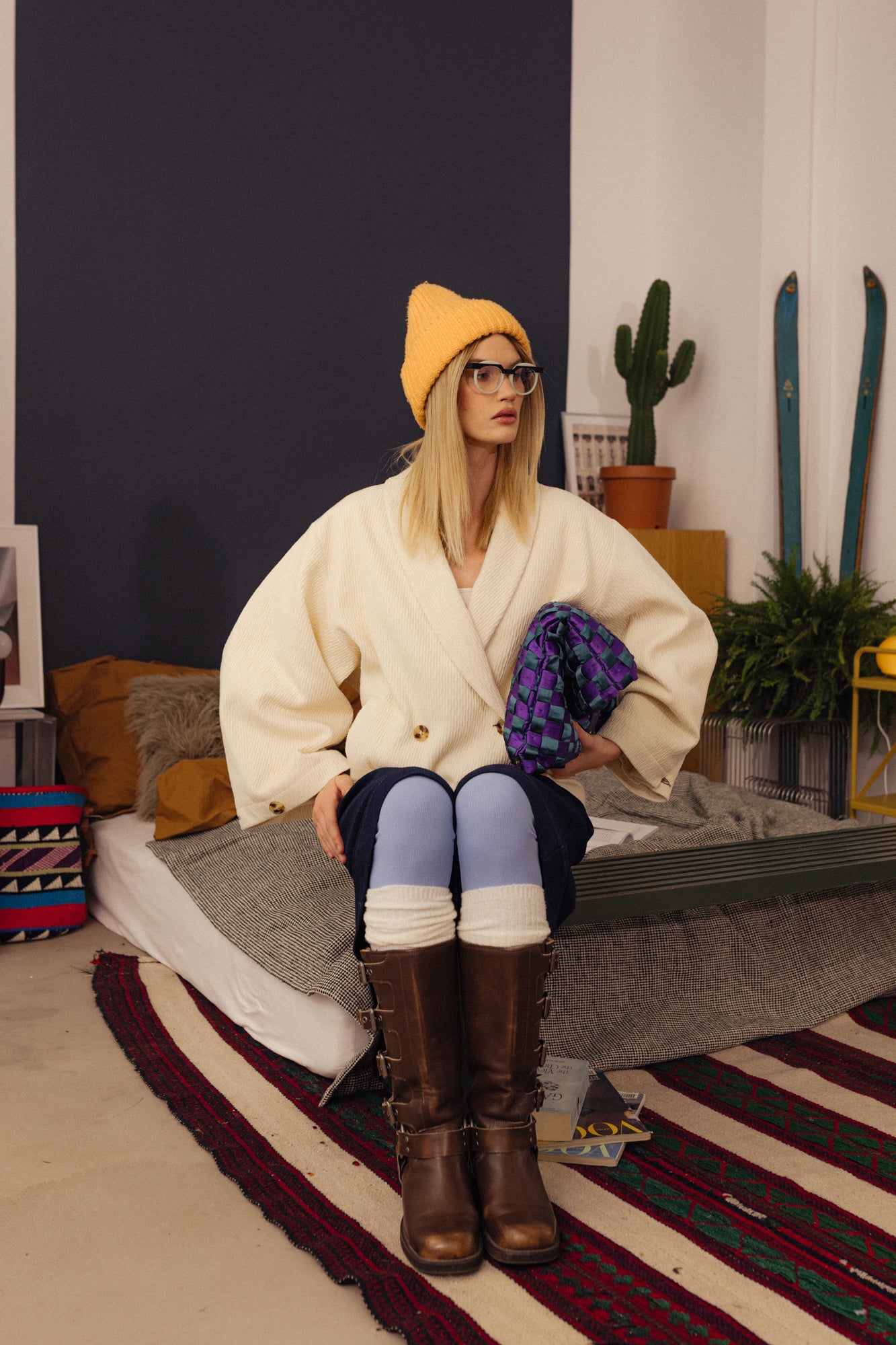Ten oversizeowy blazer jest moim prywatnym puszczeniem oka do stylu vintage, do starych klasycznych dwurzędowych swetrów i stylu apres ski.