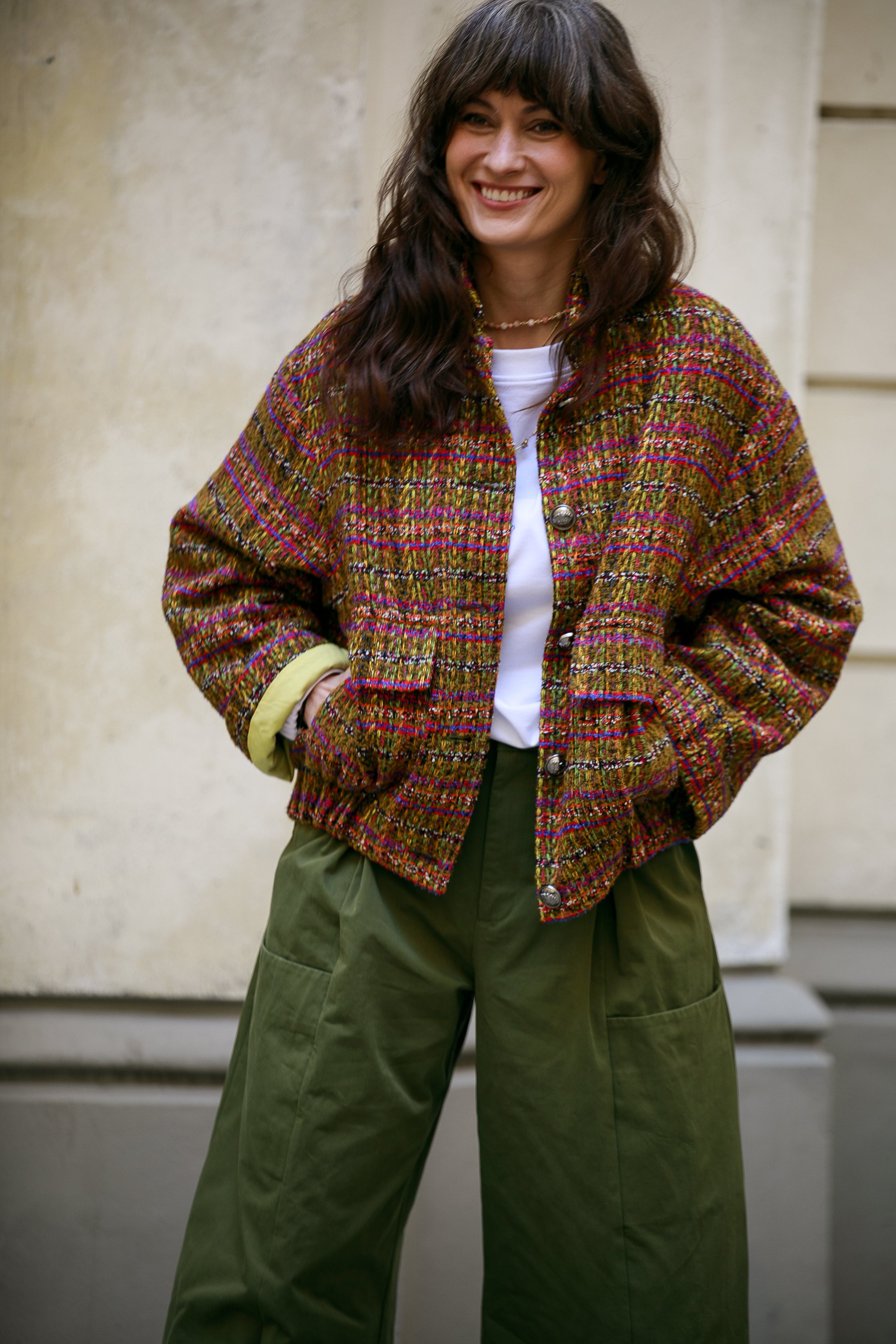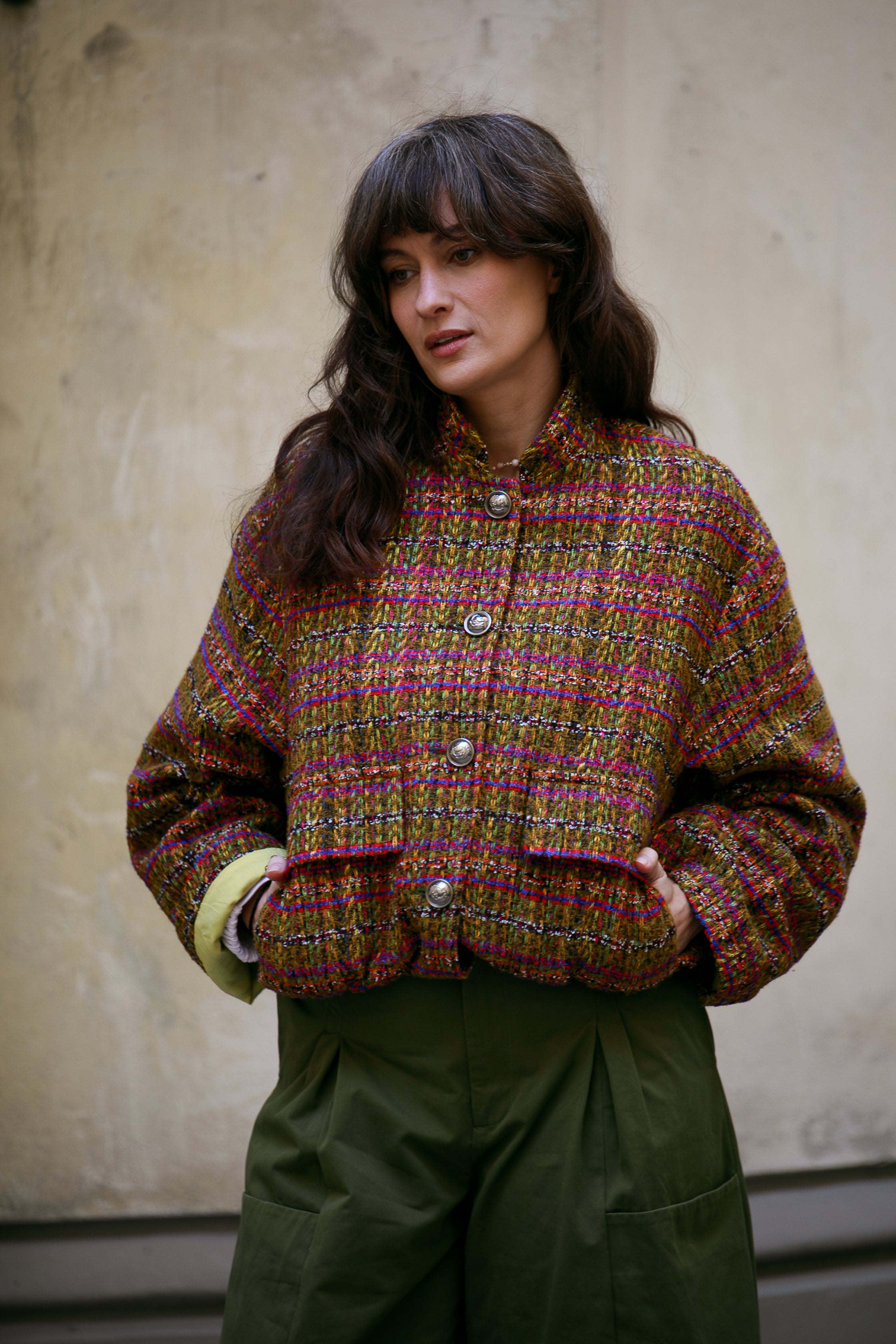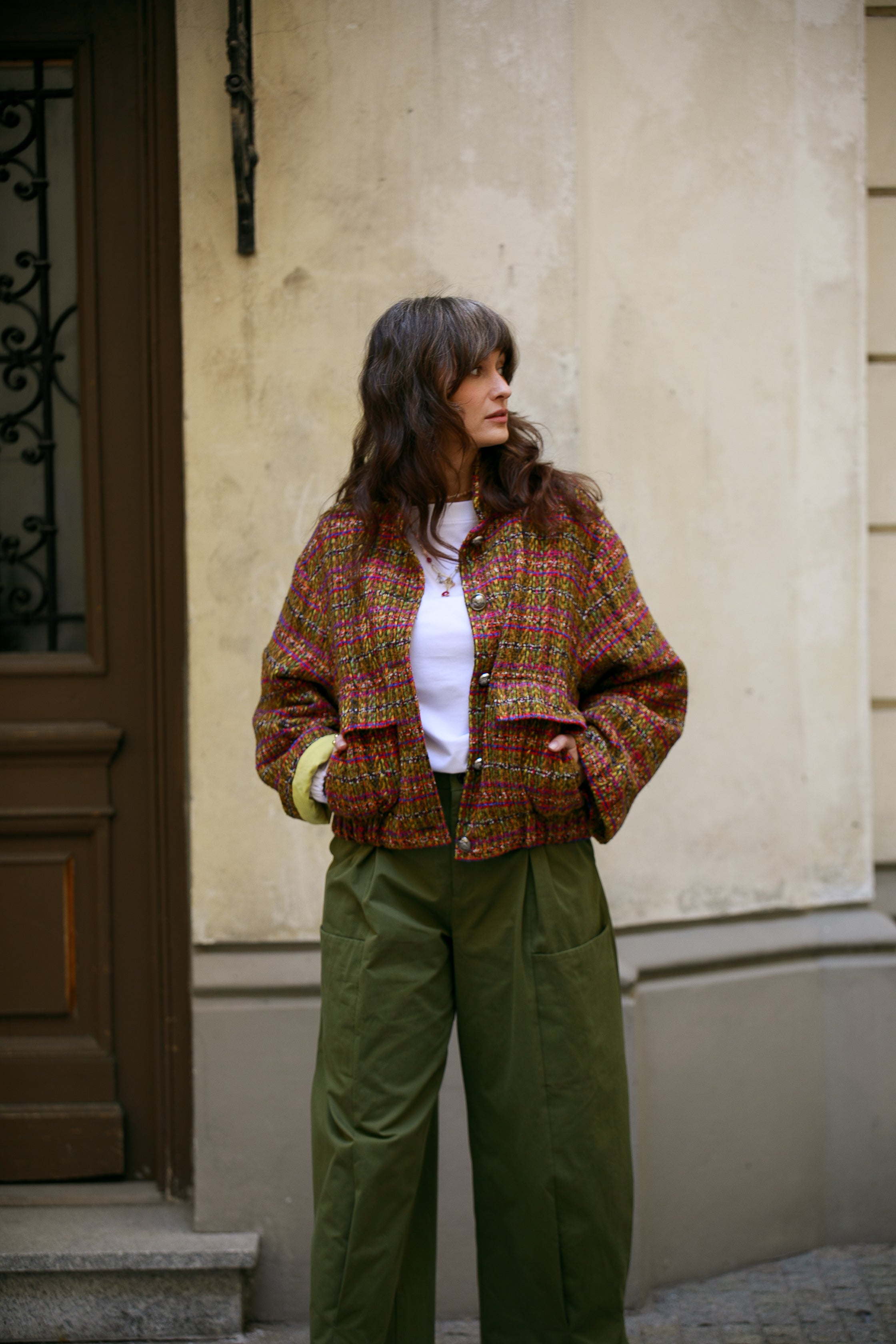 Bomber Jacket powstała z wyjątkowej tkaniny bouclé pochodzącej z jednego z najbardziej renomowanych francuskich domów mody. Charakterystyczna, lekko strukturalna krata w odcieniach zieleni, magenty i granatu została podbita żółtą, matową podszewką. To element, który sam buduje całą stylizację.