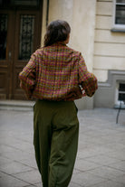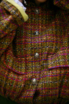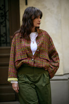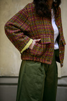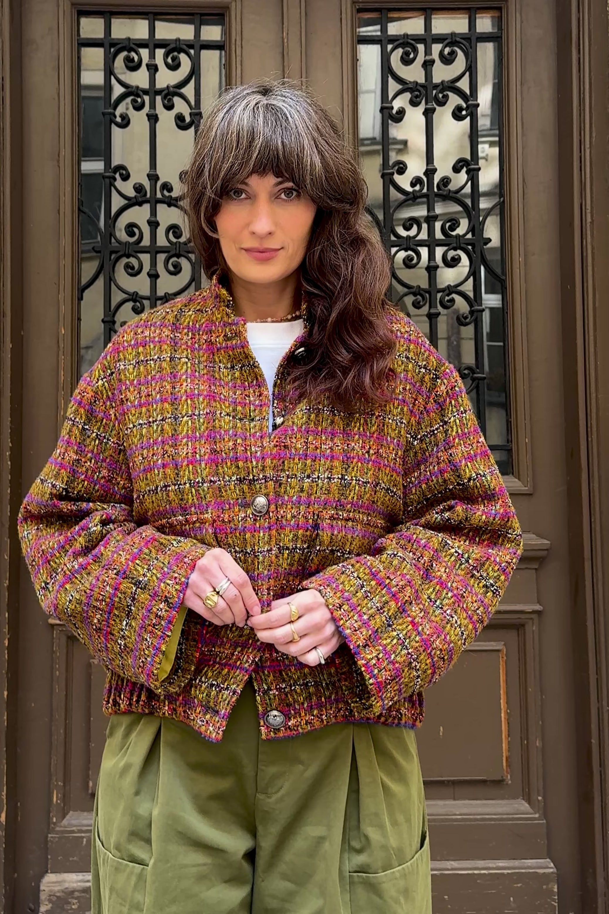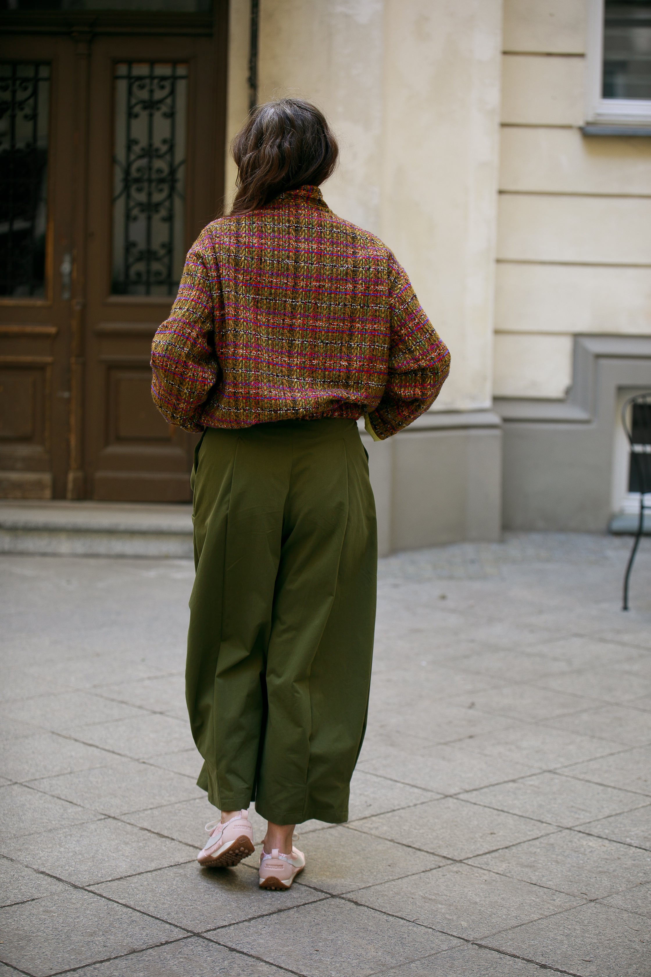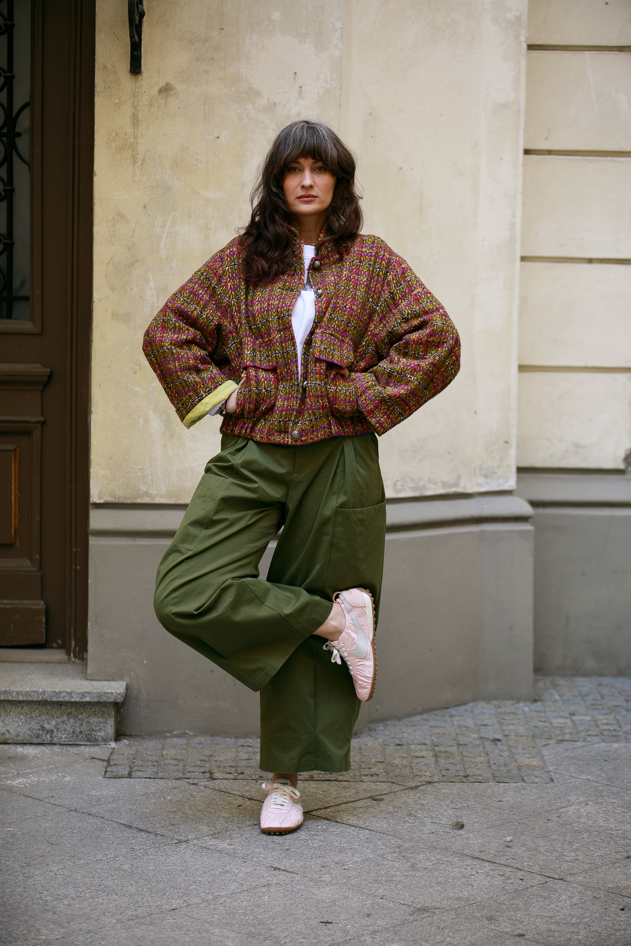 Bomber Jacket powstała z wyjątkowej tkaniny bouclé pochodzącej z jednego z najbardziej renomowanych francuskich domów mody. Charakterystyczna, lekko strukturalna krata w odcieniach zieleni, magenty i granatu została podbita żółtą, matową podszewką. To element, który sam buduje całą stylizację.