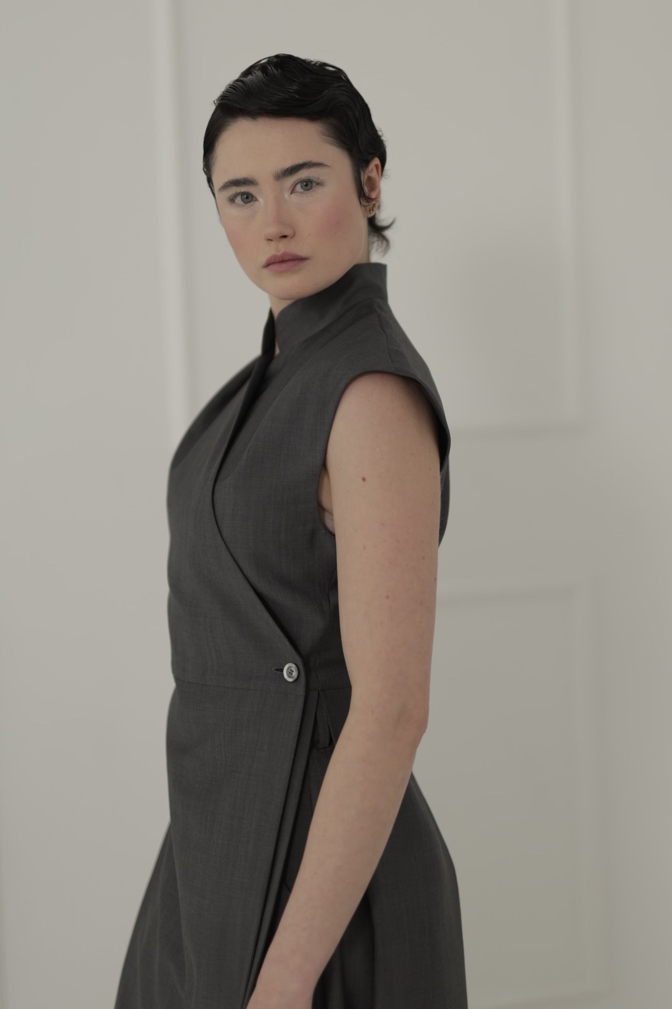 Kopertowe zapięcie na dwa guziki podkreśla talię, stójka i lekko wydłużone ramiona dodają konstrukcji, a dolna część inspirowana frakiem wprowadza lekkość i subtelny, szlachetny ruch.