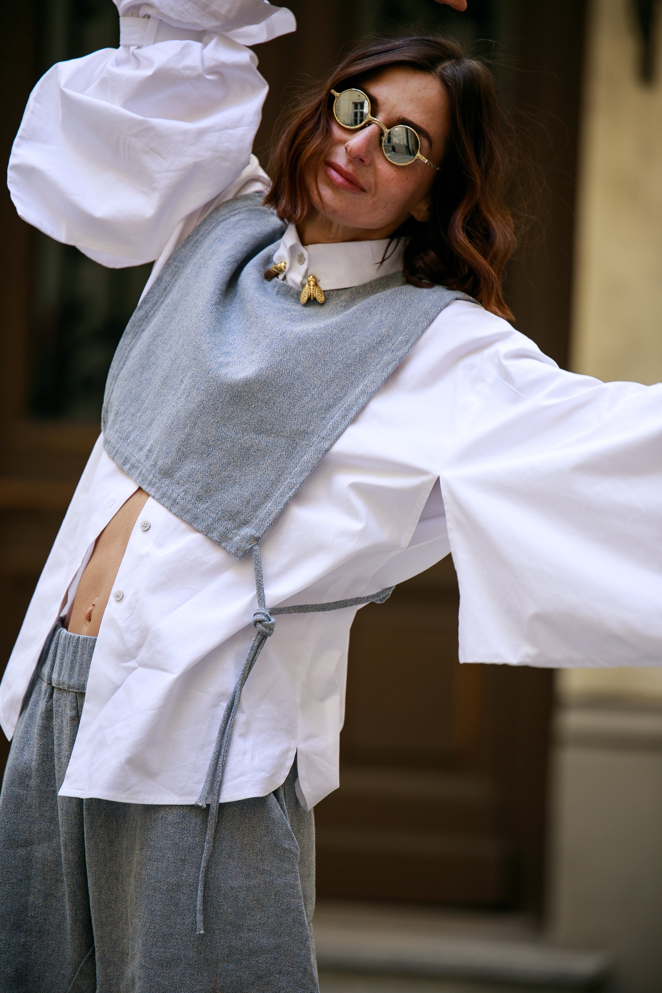 Forma jest w pełni otwarta po bokach i daje się wiązać na wiele sposobów — luźno, bliżej ciała albo całkowicie swobodnie, bez wiązania. To element, który pozwala budować sylwetkę na własnych zasadach.