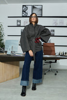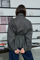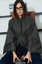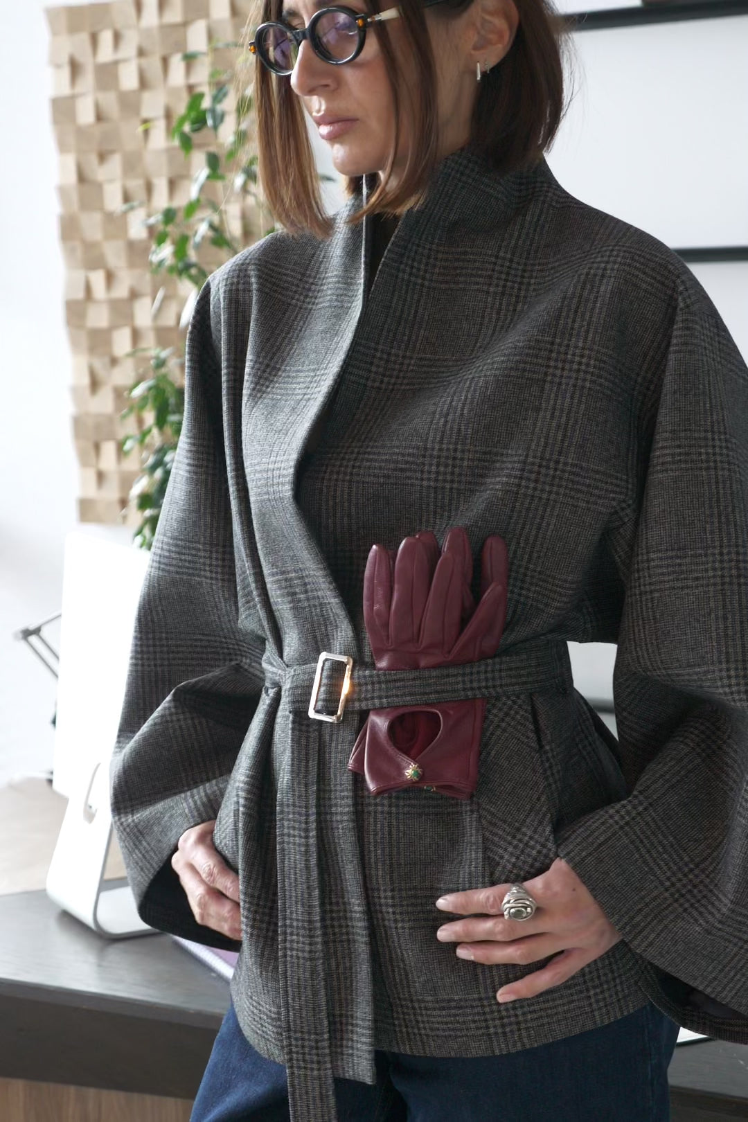 Kimono Prince of Wales powstało z archiwalnej tkaniny od Toma Forda. To wysokiej jakości wełna o bardzo gładkim, niemal jedwabistym chwycie, która pięknie układa się na sylwetce. Klasyczny wzór Prince of Wales w odcieniach szarości z nutą granatu indygo tworzy subtelną, głęboką strukturę tkaniny. To jeden z najbardziej eleganckich wzorów w historii krawiectwa, tutaj przeniesiony do współczesnej, swobodnej formy kimona.