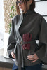 Nowy krój wyróżnia się wyższą stójką oraz szerokimi, lecz prostymi rękawami, które nadają sylwetce spokojną, nowoczesną linię. Do kimona dołączony jest pasek z tej samej tkaniny, zakończony srebrnym regulatorem.
