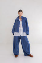Wełna żakardowa, prasowana i gładka, w odcieniu royal blue z delikatnym białym paskiem. Miękka, lekka, a jednocześnie ciepła. Na pierwszy rzut oka może przypominać bawełnę, ale wystarczy spojrzeć bliżej – paski to nie nadruk, lecz efekt żakardowego splotu. Tkanina, która łączy naturalność z elegancją i wygodą.