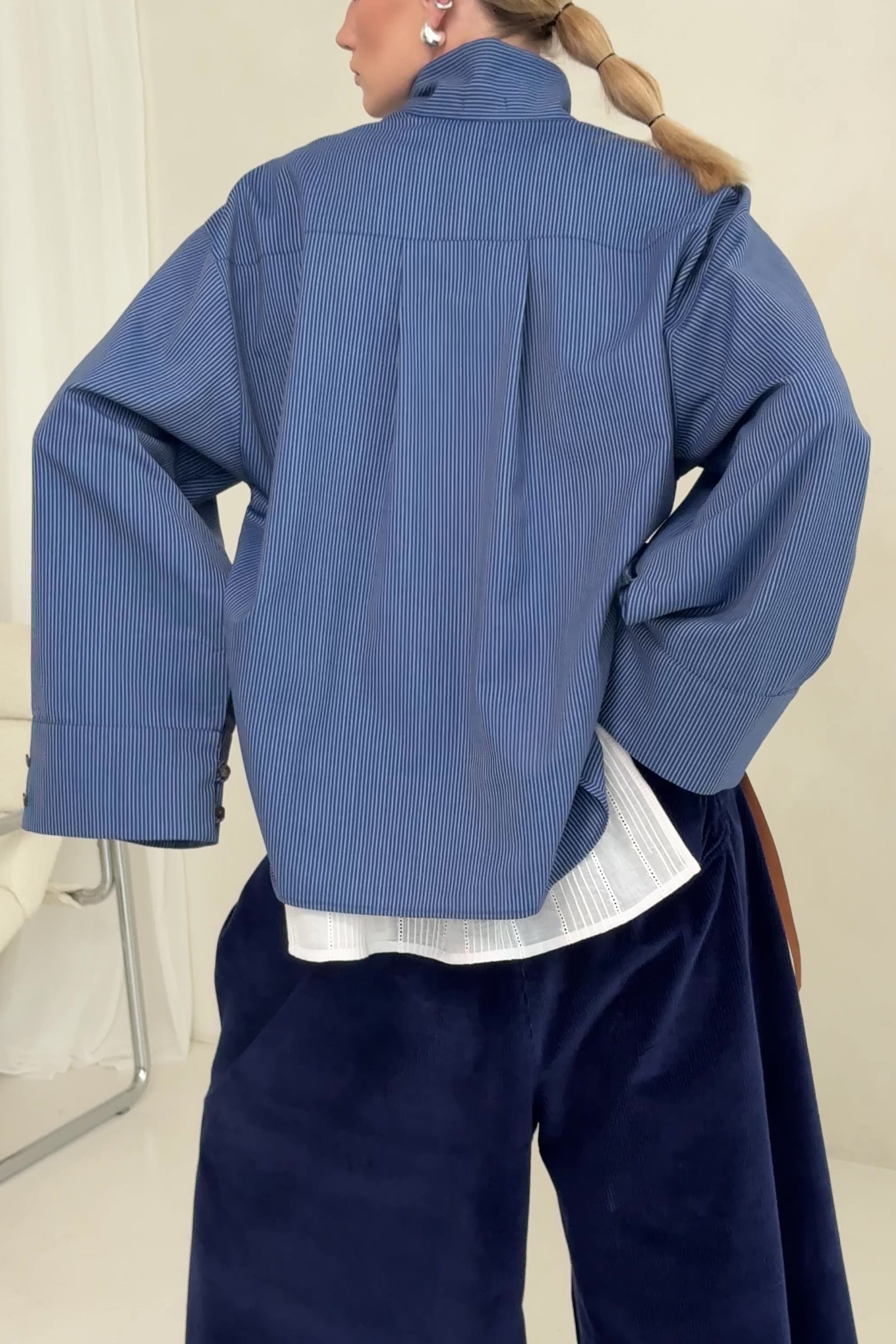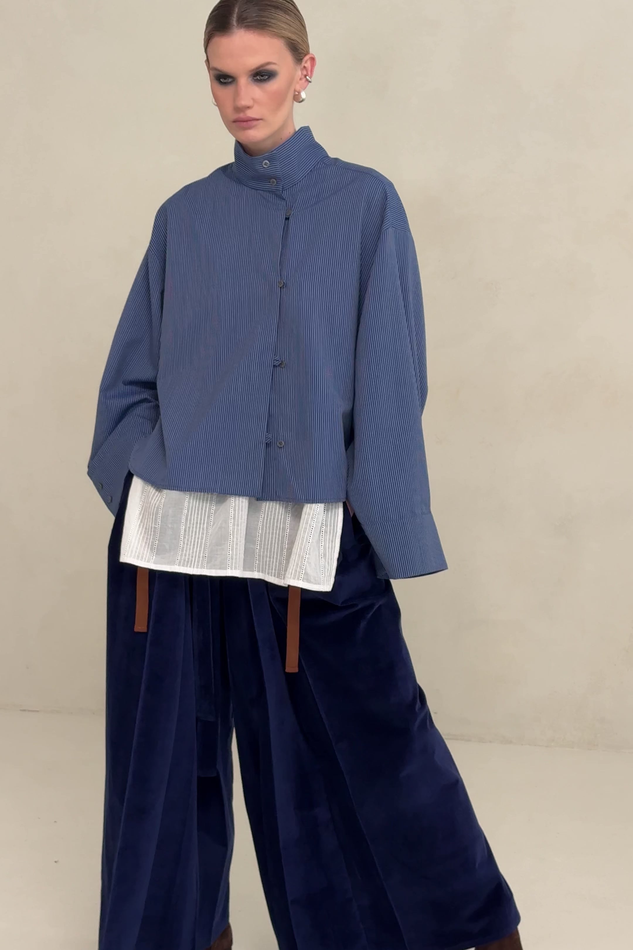Zainspirowana klasyczną koszulą Tang – z możliwością zapięcia kołnierza w stójkę i z przesuniętą linią guzików zapinanych na pętelki. Ma proste, szerokie rękawy z mankietami, które można nosić na kilka sposobów.