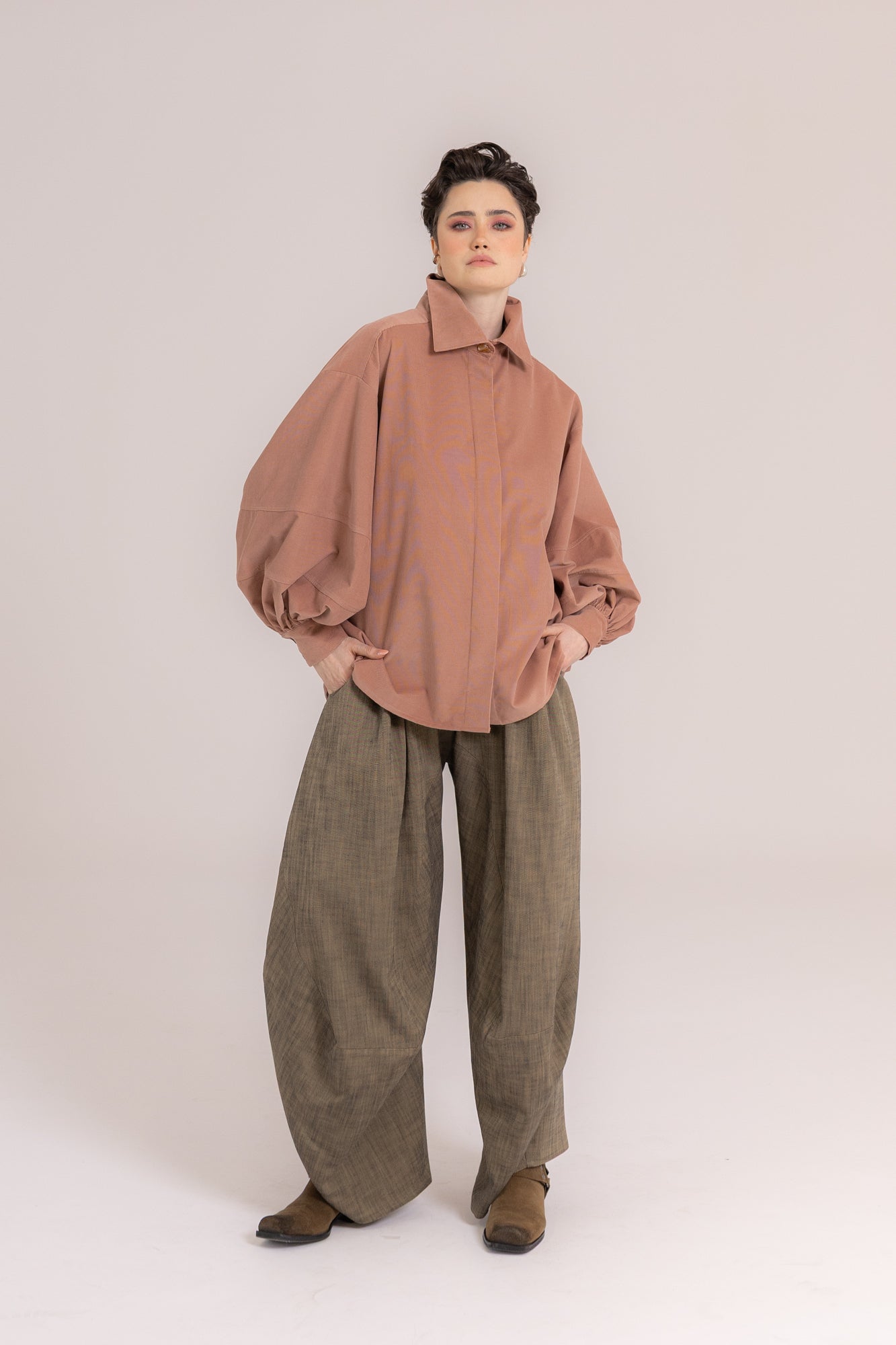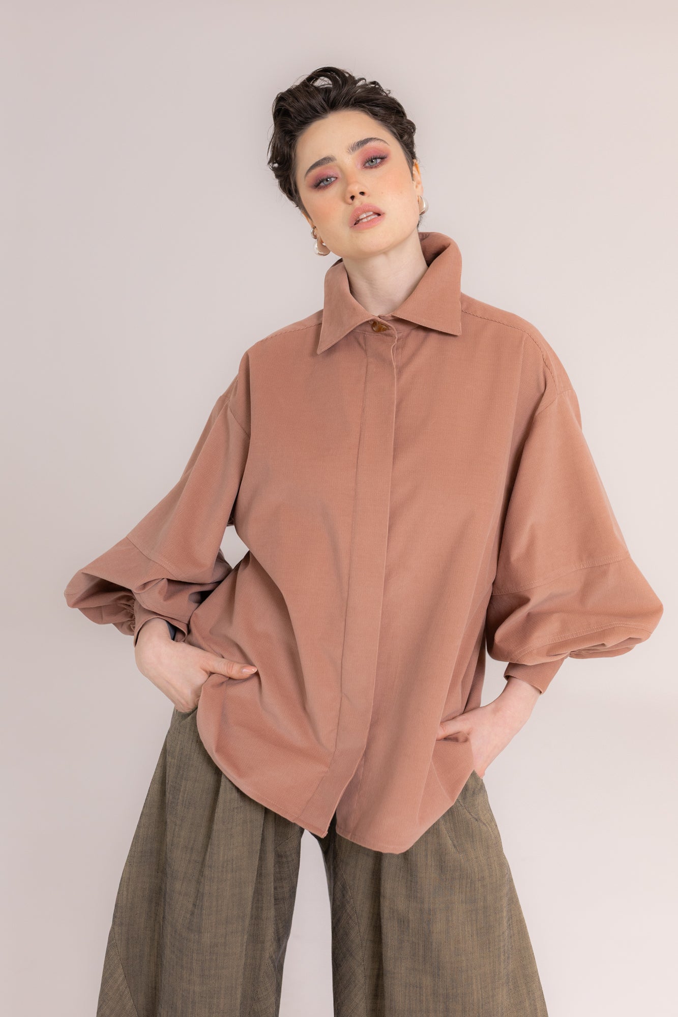 Koszula ma prosty, pudełkowy krój, który balansuje bufiaste rękawy o konstrukcji utrzymującej kształt, dłuższe mankiety oraz lekko przerysowany kołnierz, zaprojektowany tak, by harmonijnie równoważyć objętość rękawów. Pod szyją znajduje się ozdobny guzik, a pozostałe zapięcie zostało ukryte pod listwą, co nadaje całości czysty, zdecydowany charakter.