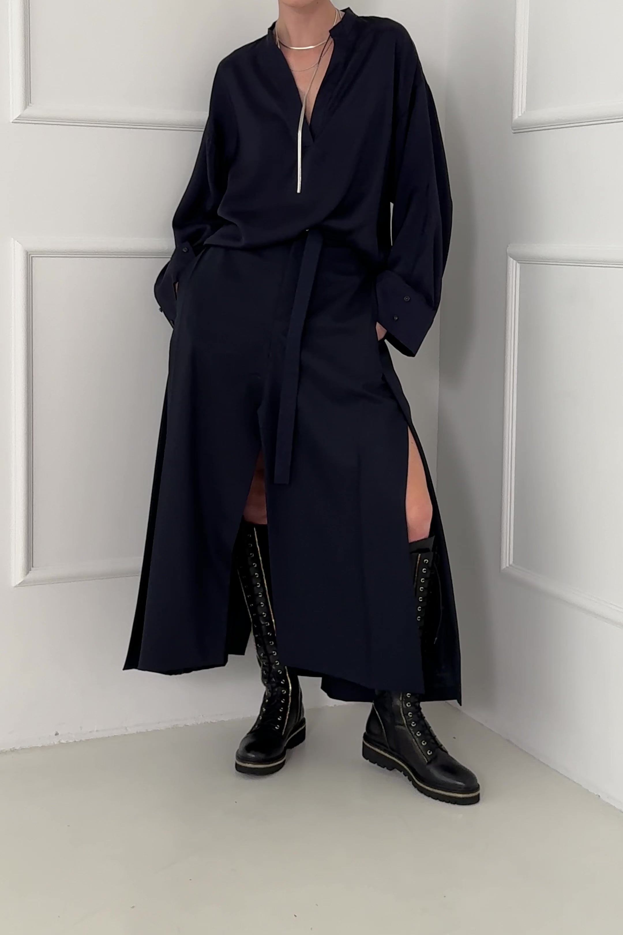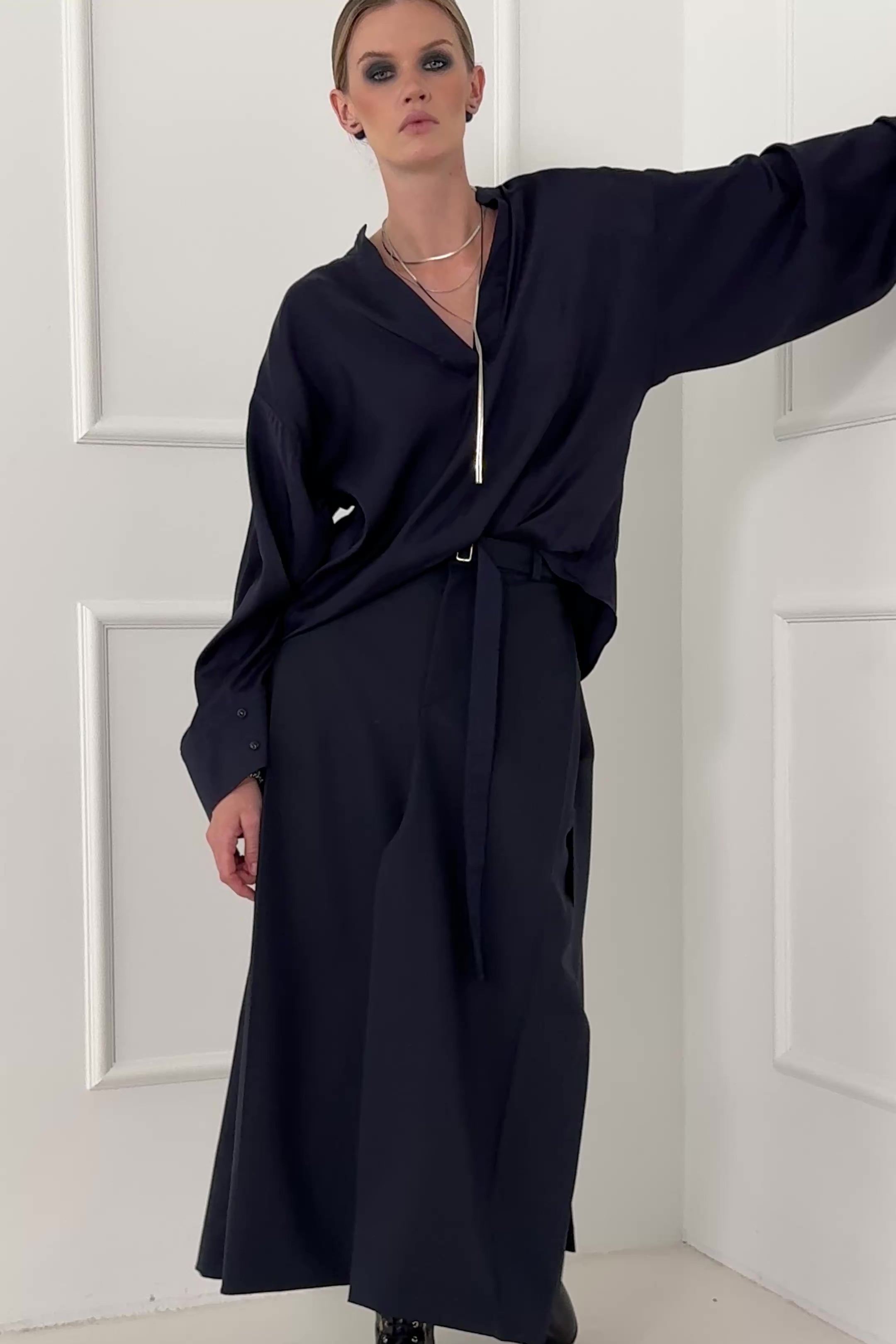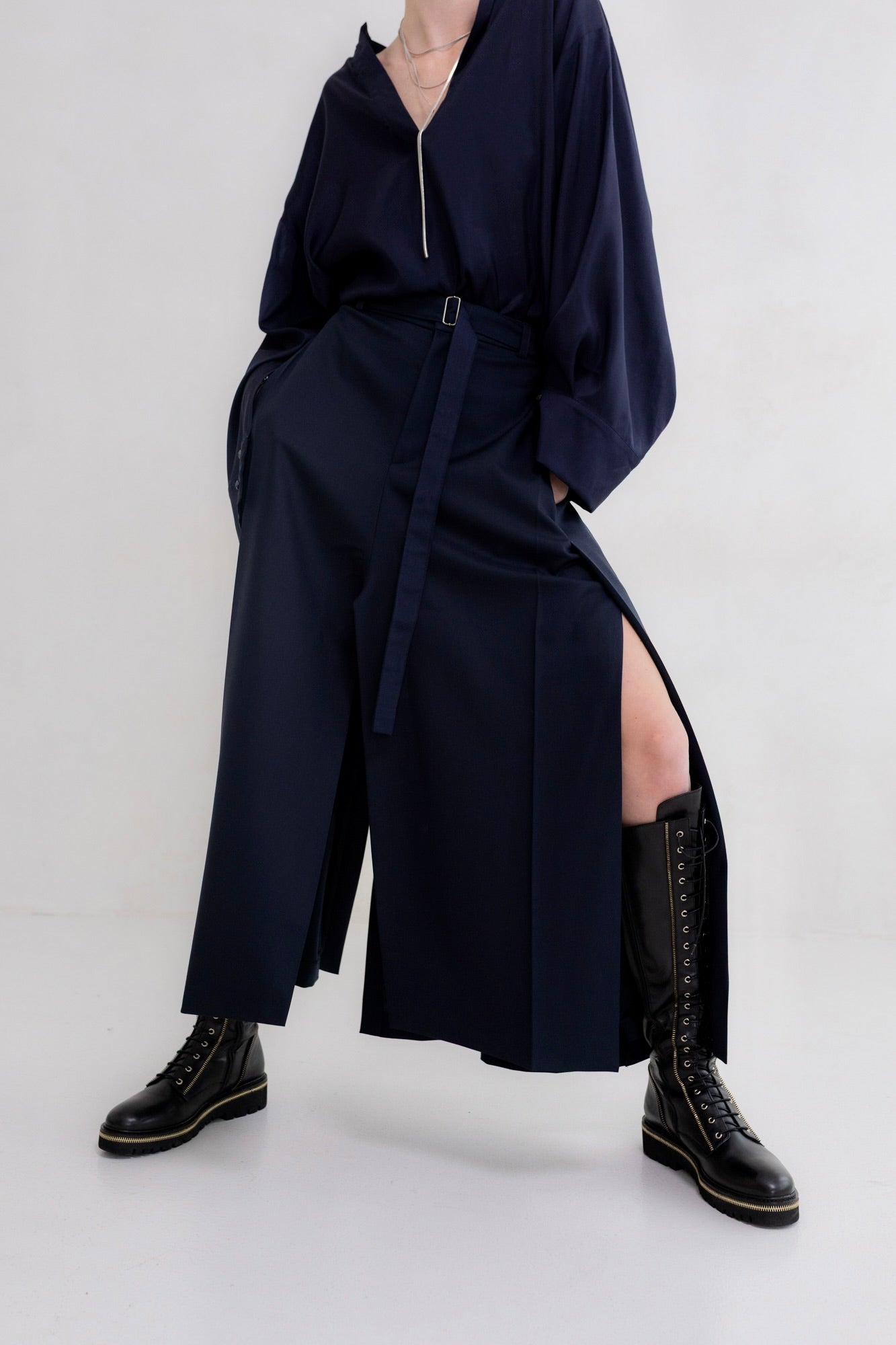 Z przodu i z tyłu, gdy stoimy statycznie, forma do złudzenia przypomina rozcięte spodnie: są tylne kieszenie z perfekcyjnym wykończeniem, z przodu klasyczny rozporek i wysokiej jakości zapięcie, szlufki, pasek podbity taśmą rypsową, a przy środkowych rozporkach widać subtelne odniesienia do konstrukcji kroku. Wszystko po to, by w pełni oddać dekonstrukcyjny charakter projektu.