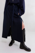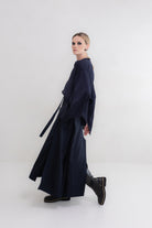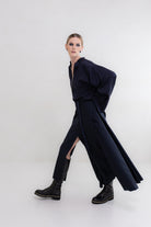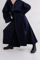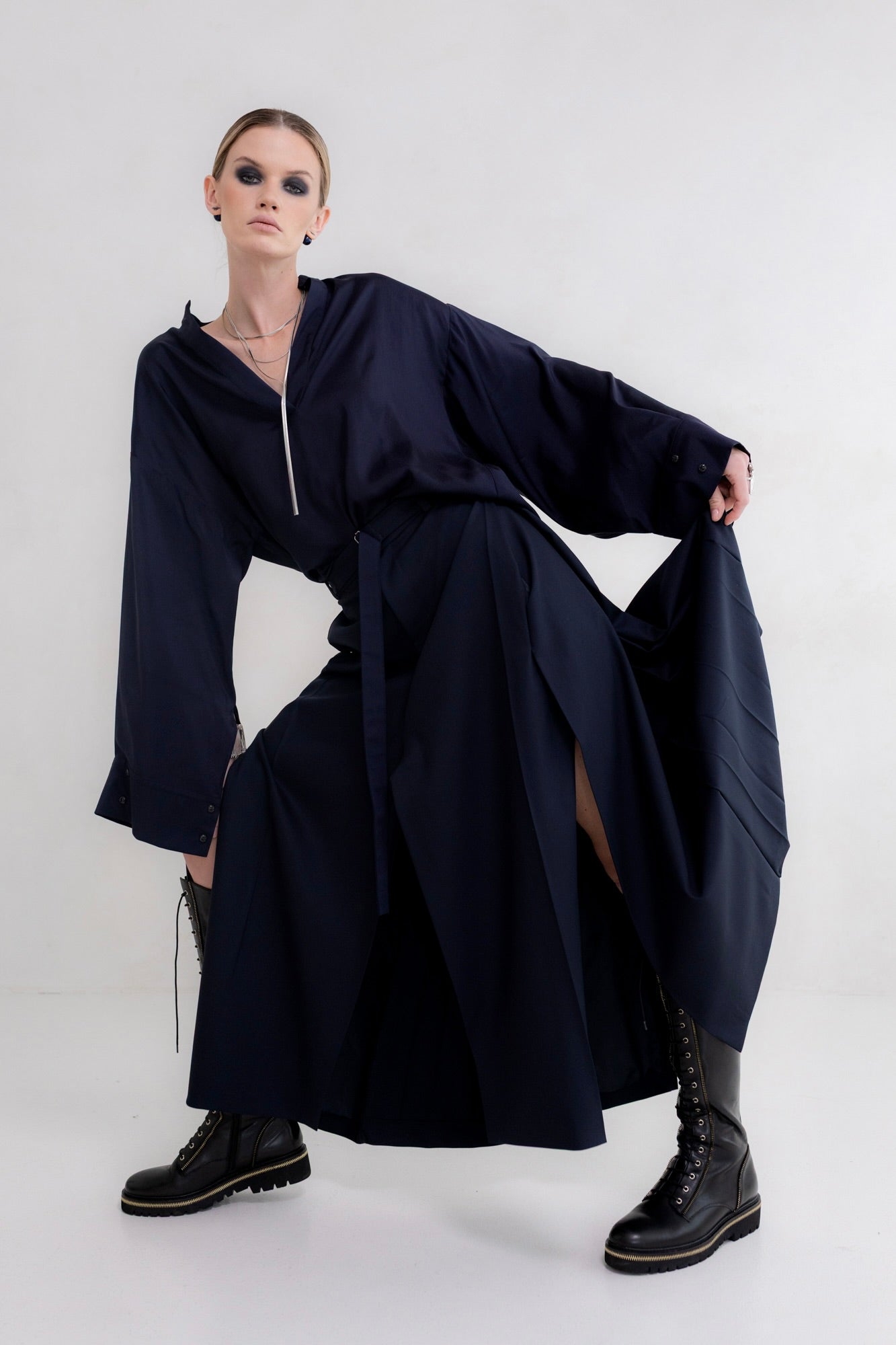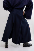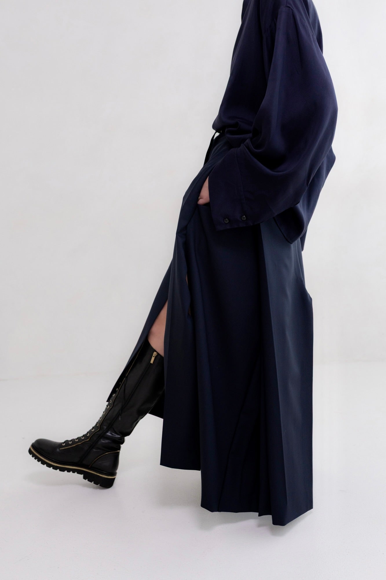 Czas na moją perełkę w kolekcji: spódnicę DeConstruct no.1. Powstała jako ukłon w stronę mojego zamiłowania do japońskiej idei dekonstrukcji klasyków. Tym razem punktem wyjścia był tradycyjny krój spodni garniturowych, przeorganizowany konstrukcyjnie tak, by stworzyć linię niebanalnej spódnicy.