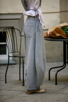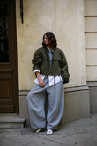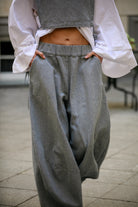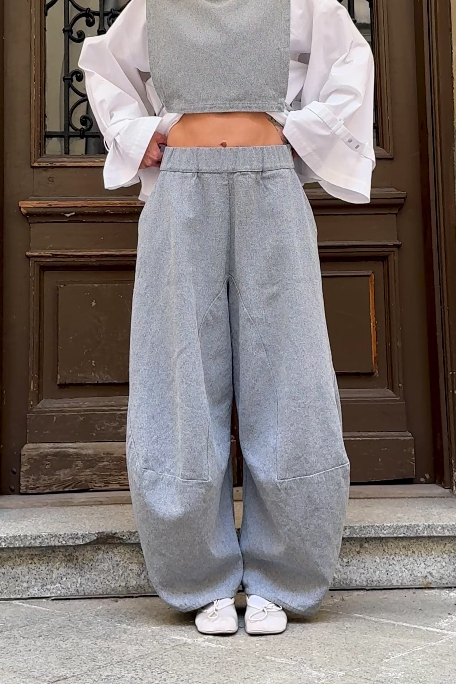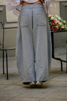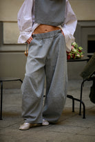 Sojo to spodnie z lekko obniżonym krokiem, które podkreślają talię i delikatnie rozszerzają się od kolan. Fason typu barrel nadaje im objętości, a sprytne przeszycia i konstrukcyjne szwy utrzymują kształt i rytm formy.