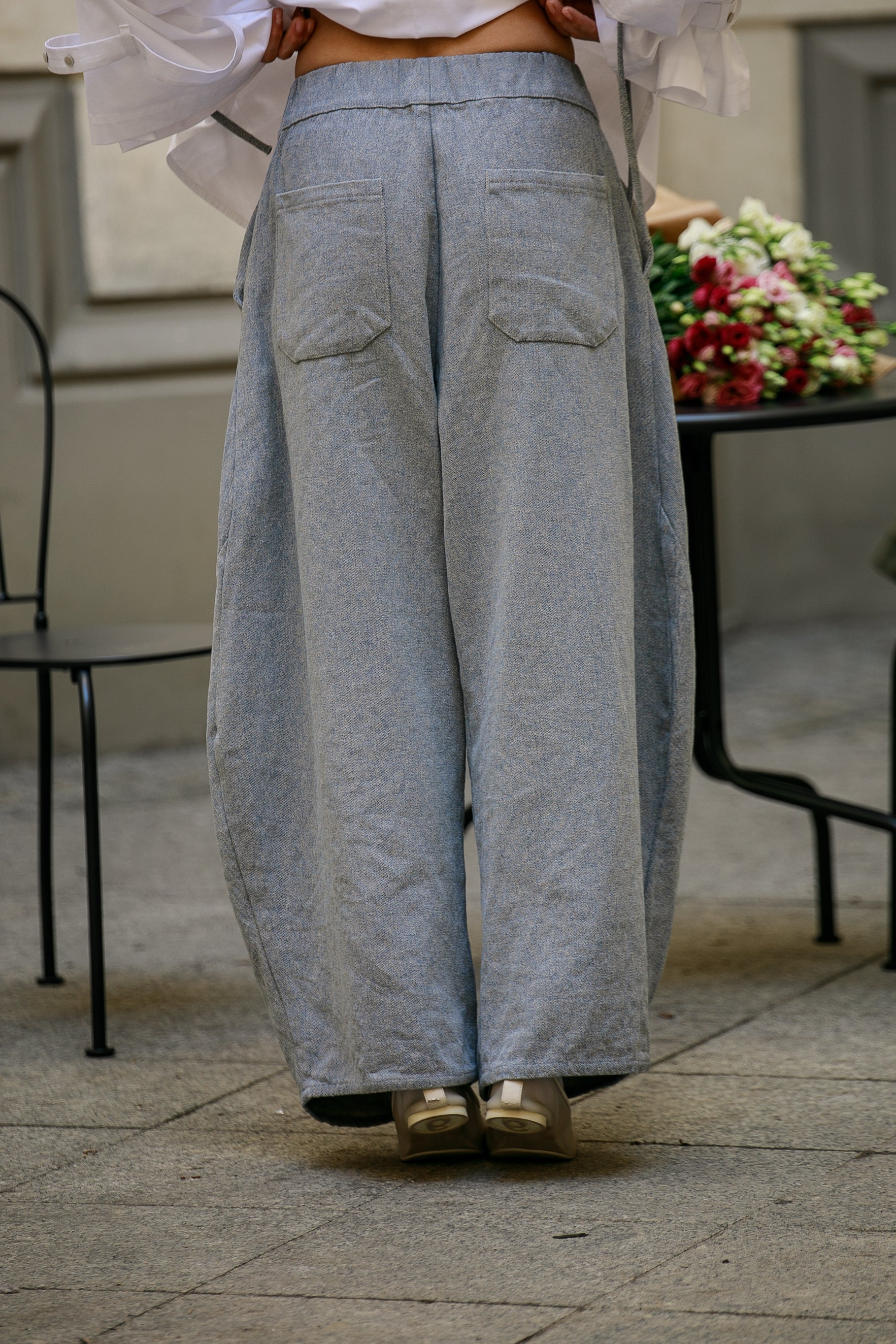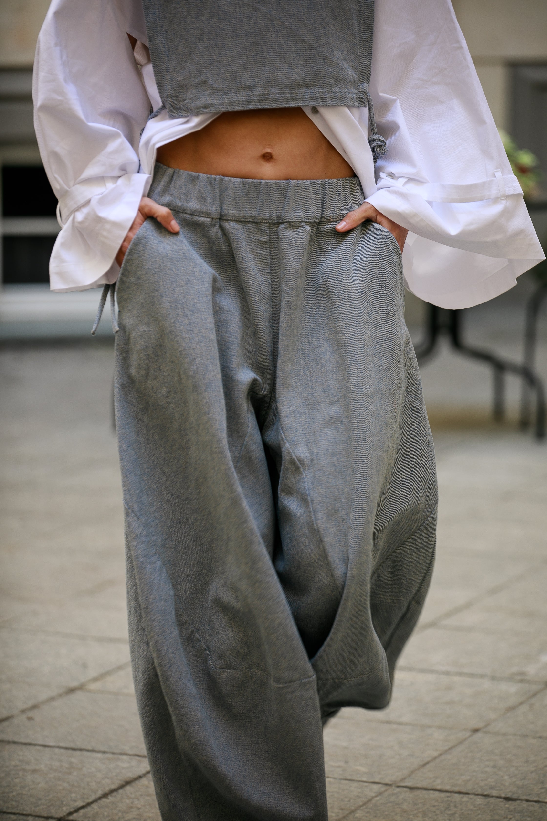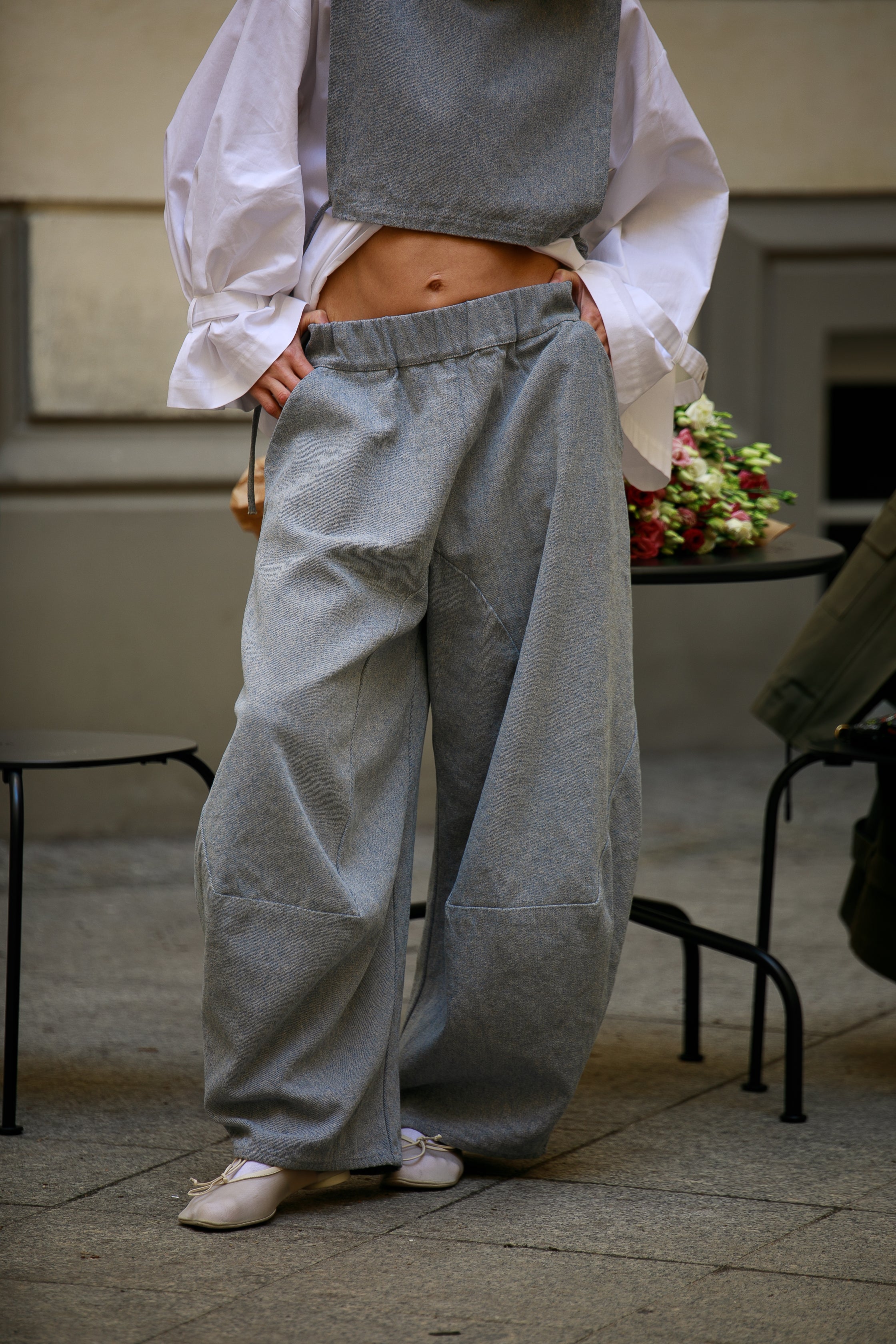 Uszyte z mięsistego, a jednocześnie miękkiego denimu będącego mieszanką bawełny i włókien konopnych. To tkanina o wyważonym charakterze – solidna i trwała, a przy tym przyjemna w dotyku i dobrze pracująca w ruchu. Dzięki swojej strukturze świetnie trzyma formę, podkreślając architekturę kroju.