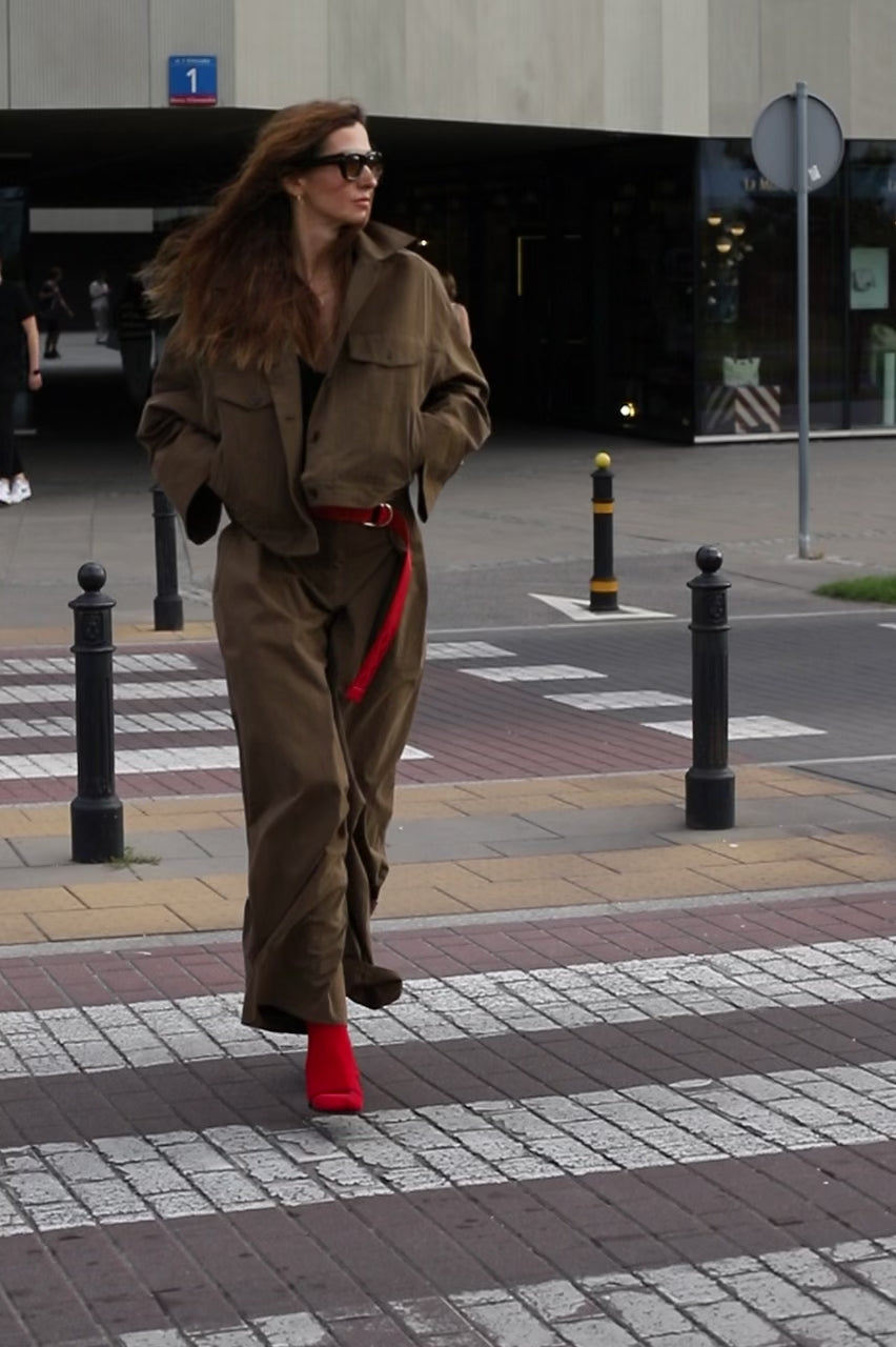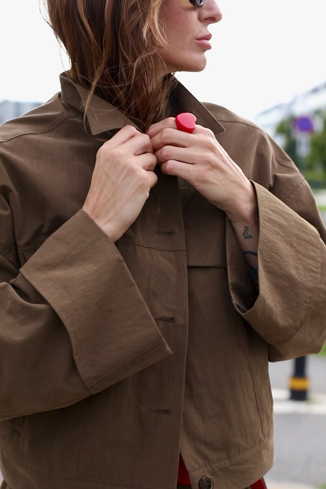 A tkanina to prawdziwa perełka: lekko techniczna bawełna z domieszką nylonu: lekka w noszeniu, strukturalna i w fenomenalnym kolorze skórki kiwi