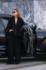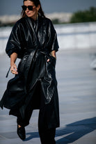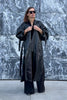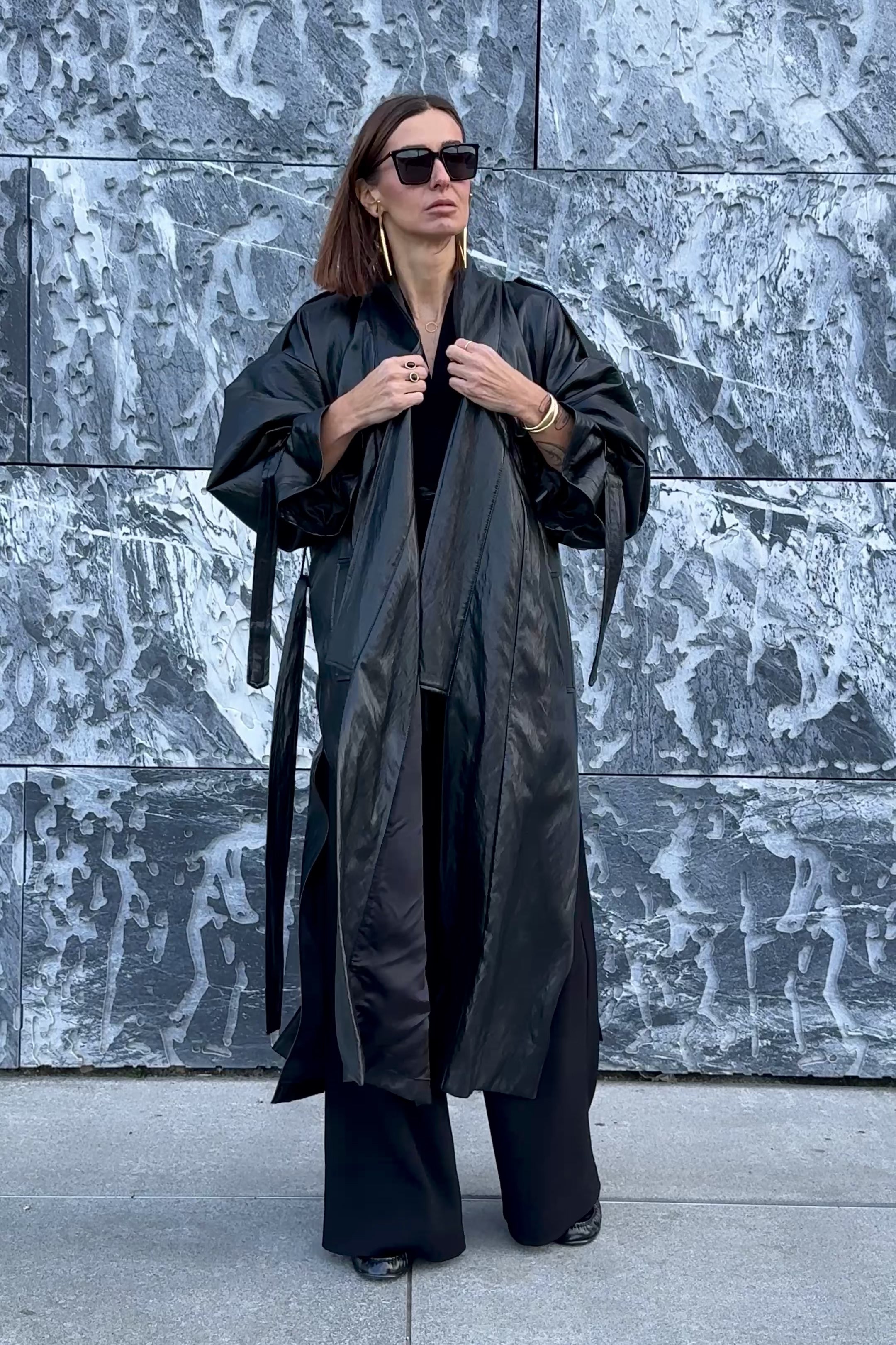 Czarny oversize’owy trench łączy w sobie mocną, kobiecą sylwetkę lat 80. z inspiracją tradycyjnym japońskim samue – strojem noszonym niegdyś przez mnichów Zen jako odzież robocza.