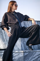 Krój prostych, szerokich nogawek uzupełniają kontrafałdy, które – w odróżnieniu od klasycznych zakładek – nie dodają objętości, lecz wydłużają linię nogi i układają się wyjątkowo elegancko.