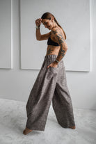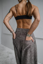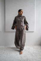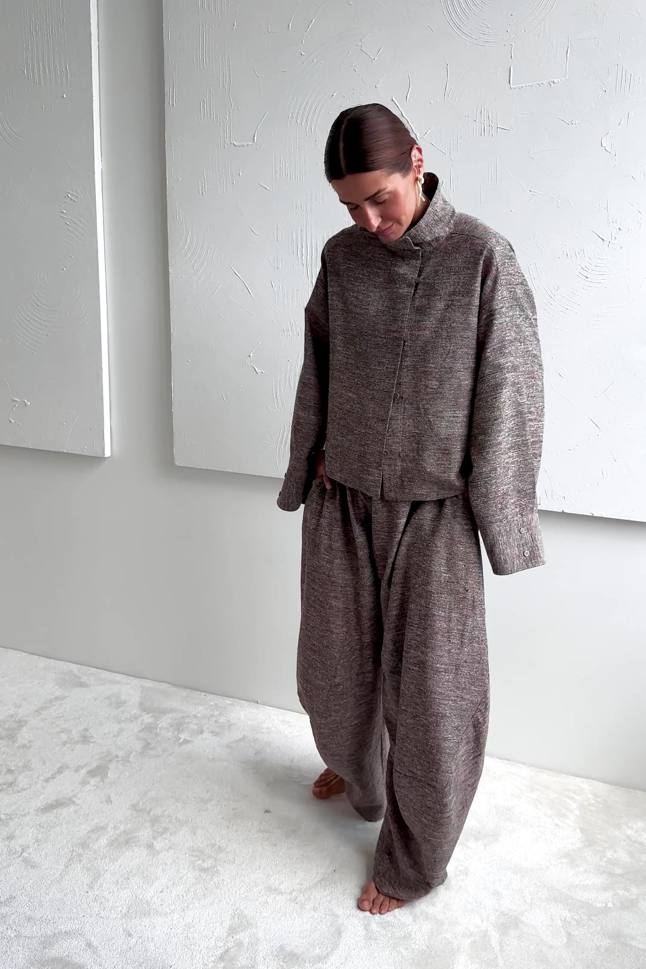 Sojo to spodnie z lekko obniżonym krokiem, które podkreślają talię i delikatnie rozszerzają się od kolan. Fason typu barrel nadaje im objętości, a sprytne przeszycia i konstrukcyjne szwy utrzymują kształt i rytm formy.