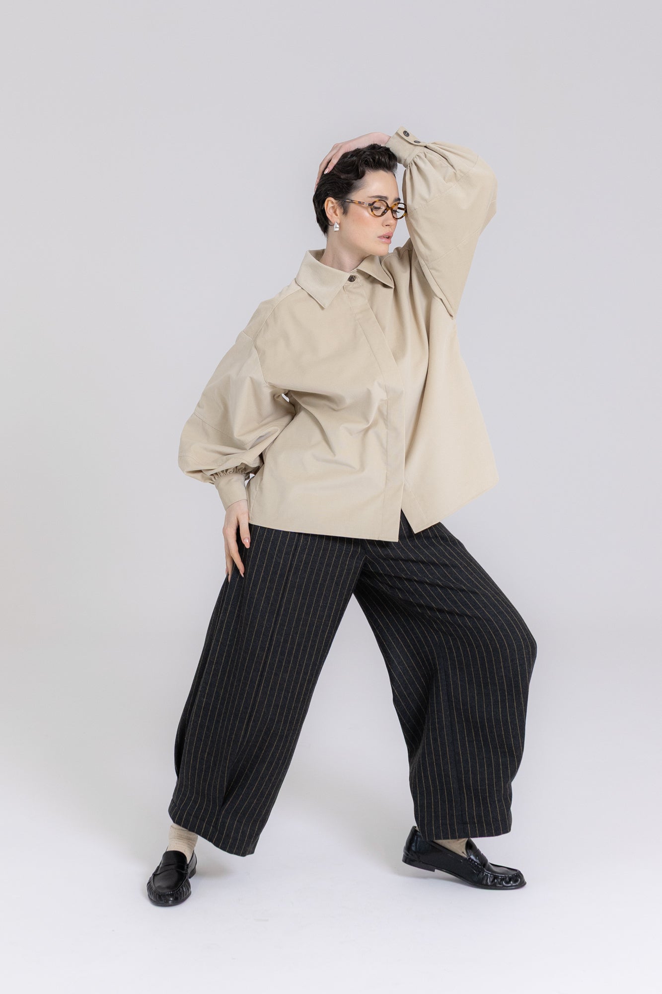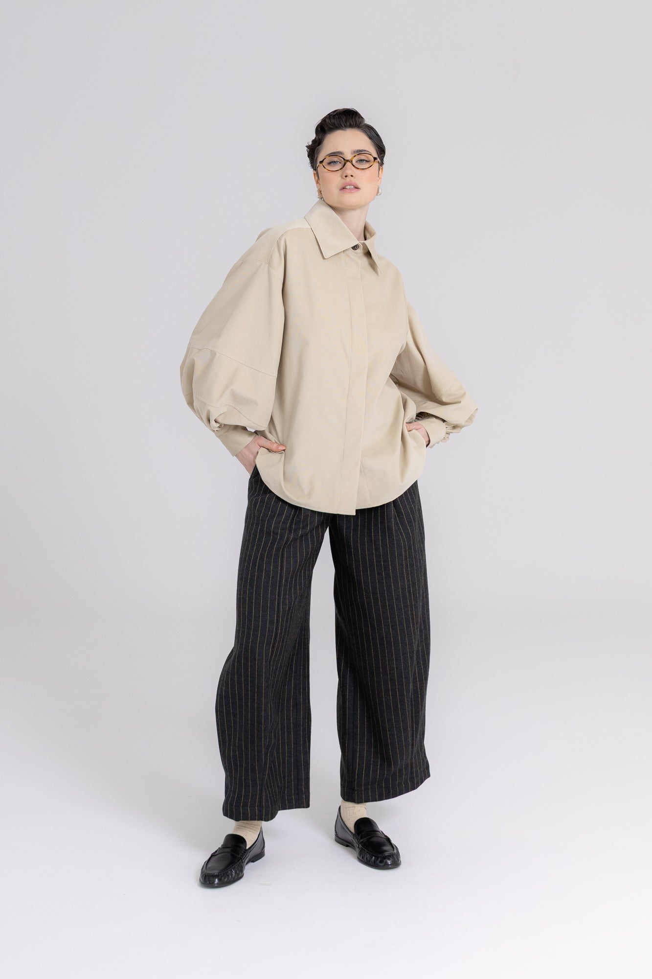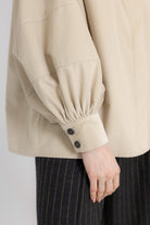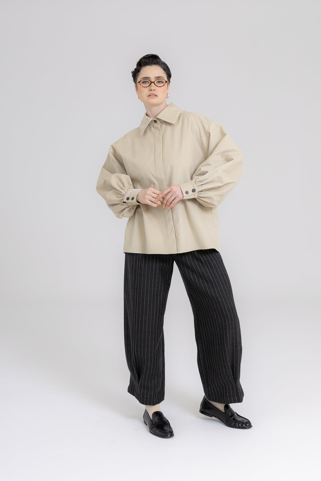 Koszula ma prosty, pudełkowy krój, który balansuje bufiaste rękawy o konstrukcji utrzymującej kształt, dłuższe mankiety oraz lekko przerysowany kołnierz, zaprojektowany tak, by harmonijnie równoważyć objętość rękawów. Pod szyją znajduje się ozdobny guzik, a pozostałe zapięcie zostało ukryte pod listwą, co nadaje całości czysty, zdecydowany charakter.