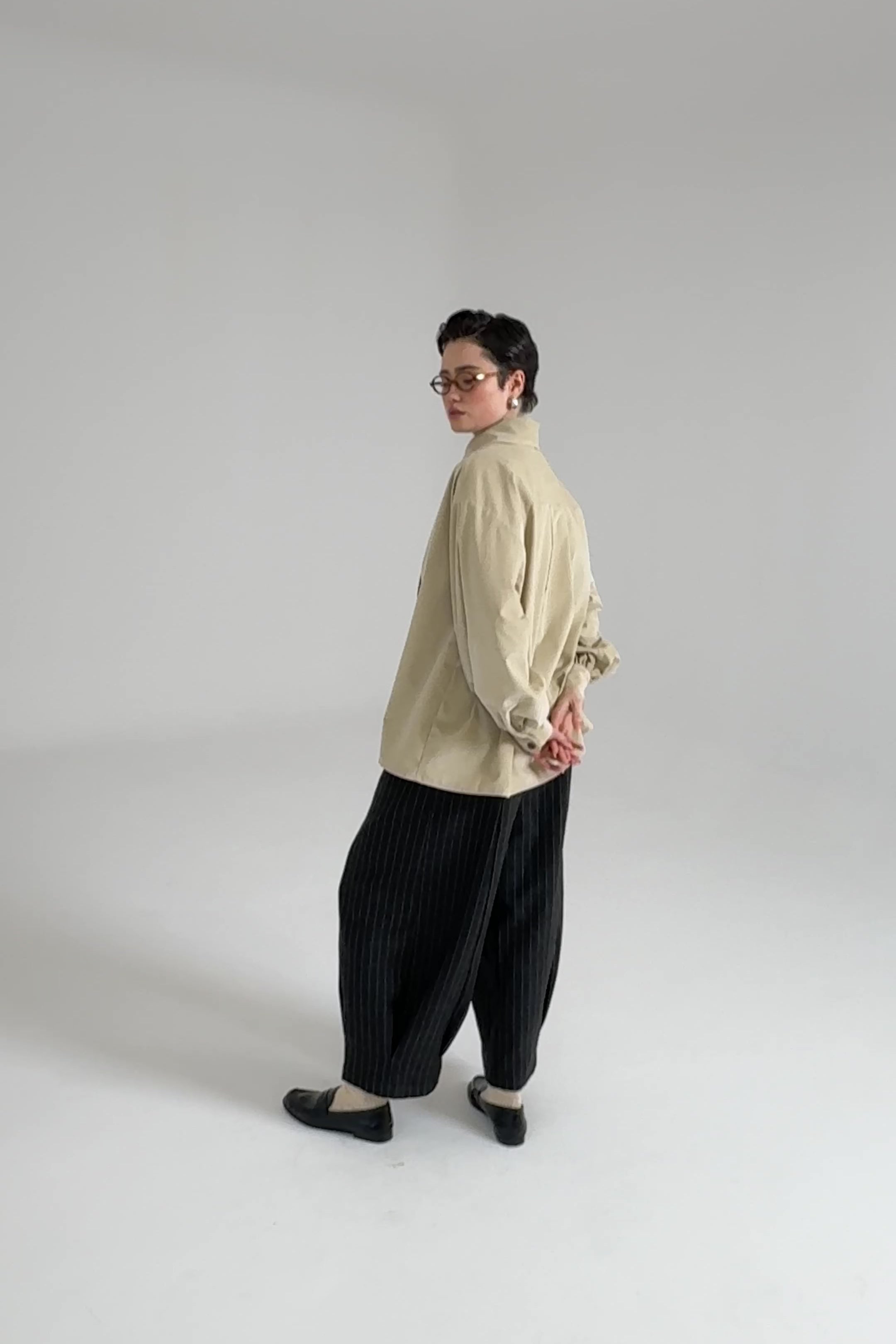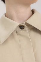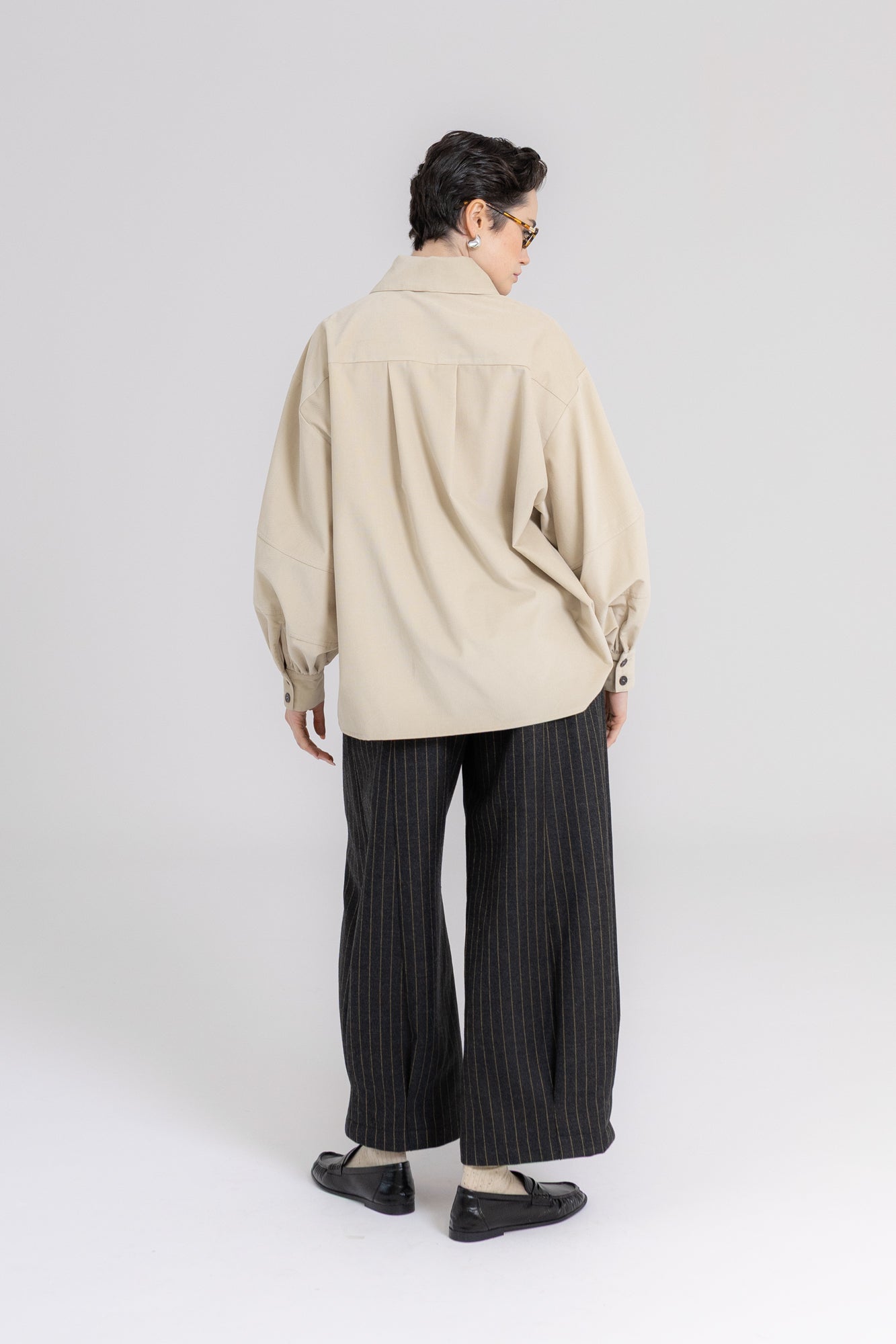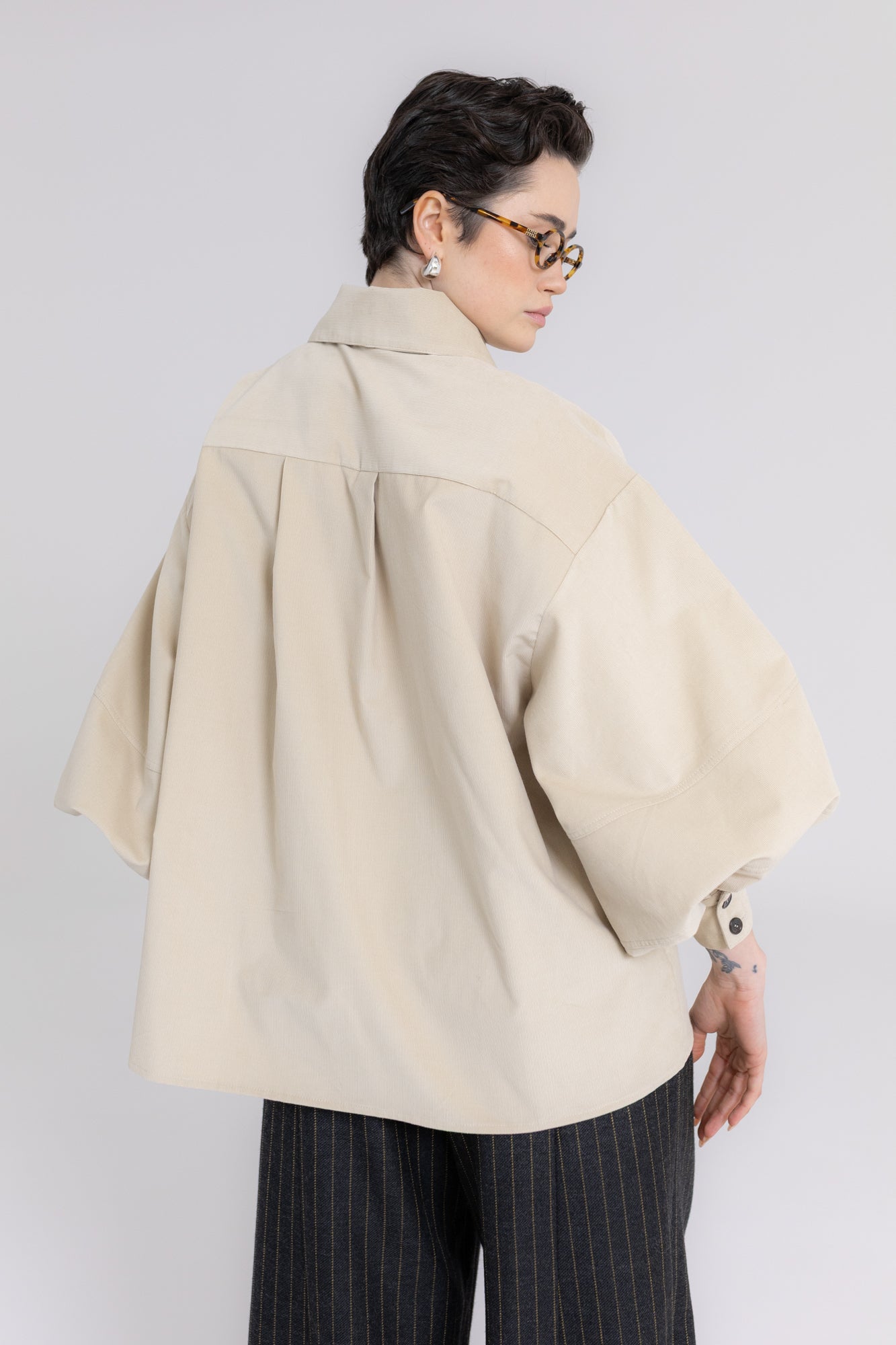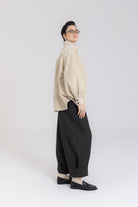 Koszula ma prosty, pudełkowy krój, który balansuje bufiaste rękawy o konstrukcji utrzymującej kształt, dłuższe mankiety oraz lekko przerysowany kołnierz, zaprojektowany tak, by harmonijnie równoważyć objętość rękawów. Pod szyją znajduje się ozdobny guzik, a pozostałe zapięcie zostało ukryte pod listwą, co nadaje całości czysty, zdecydowany charakter.