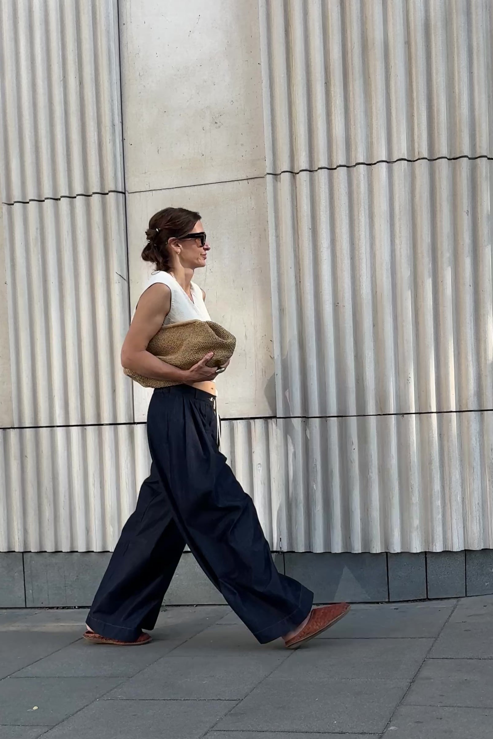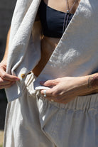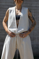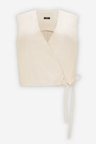 Tao to prosta kamizelka, która działa w zależności od tego, jak ją założysz. Możesz zostawić ją luźną albo dopasować do sylwetki – dzięki wewnętrznym guzikom i ściągaczowi w talii.
