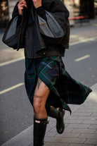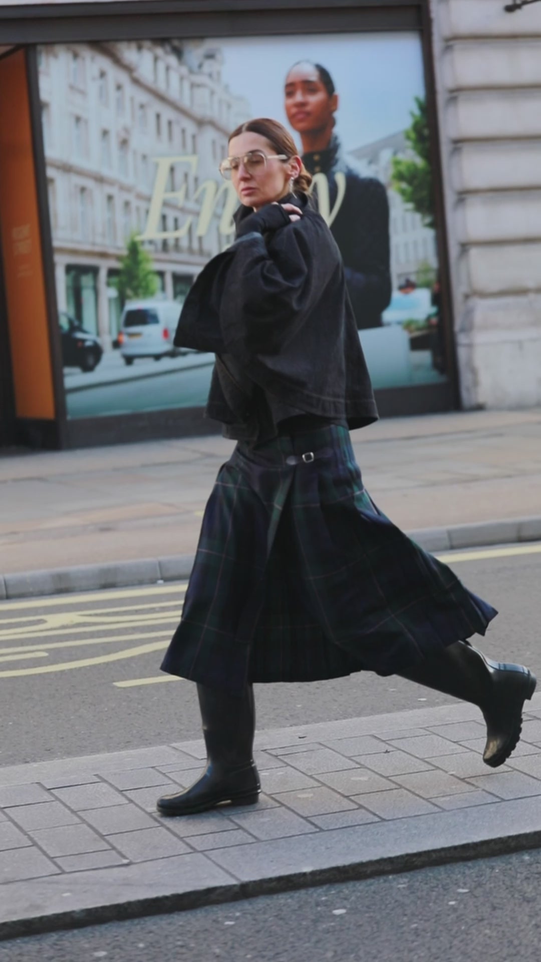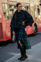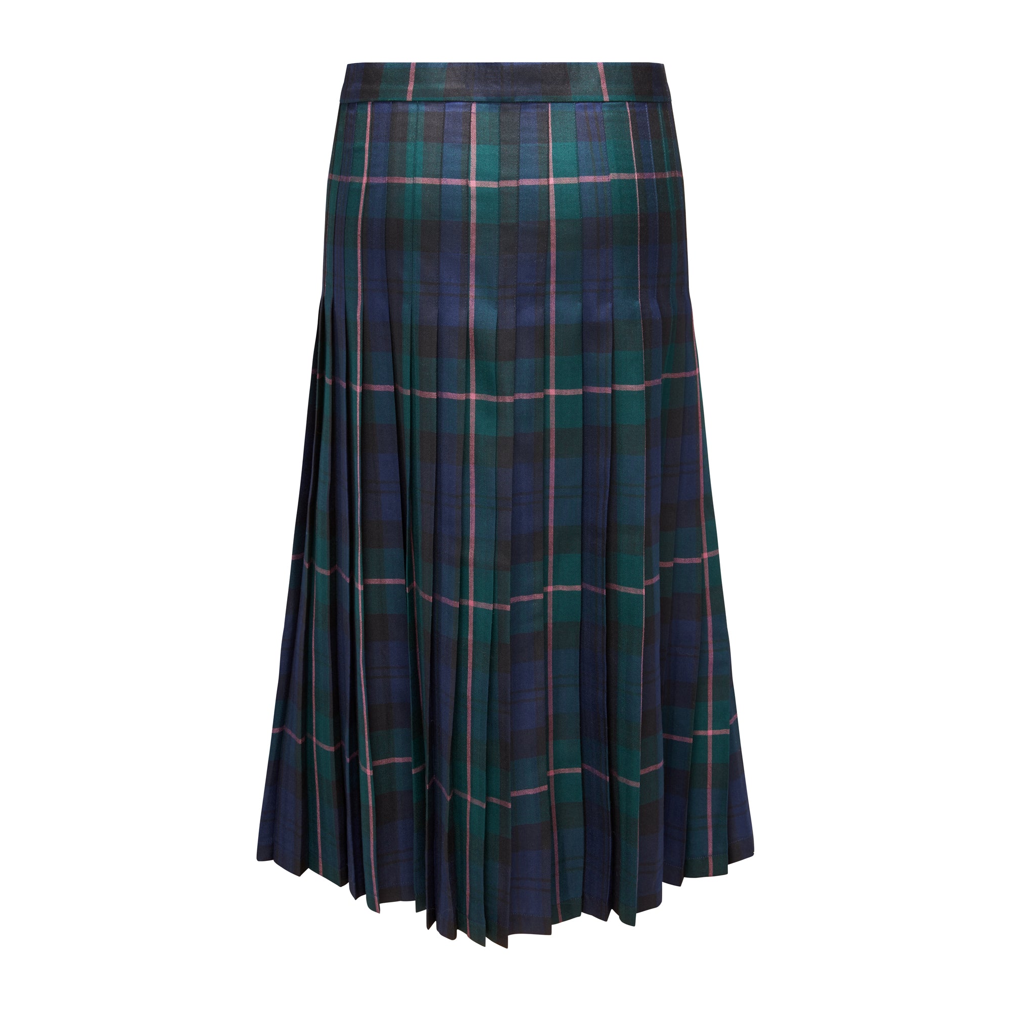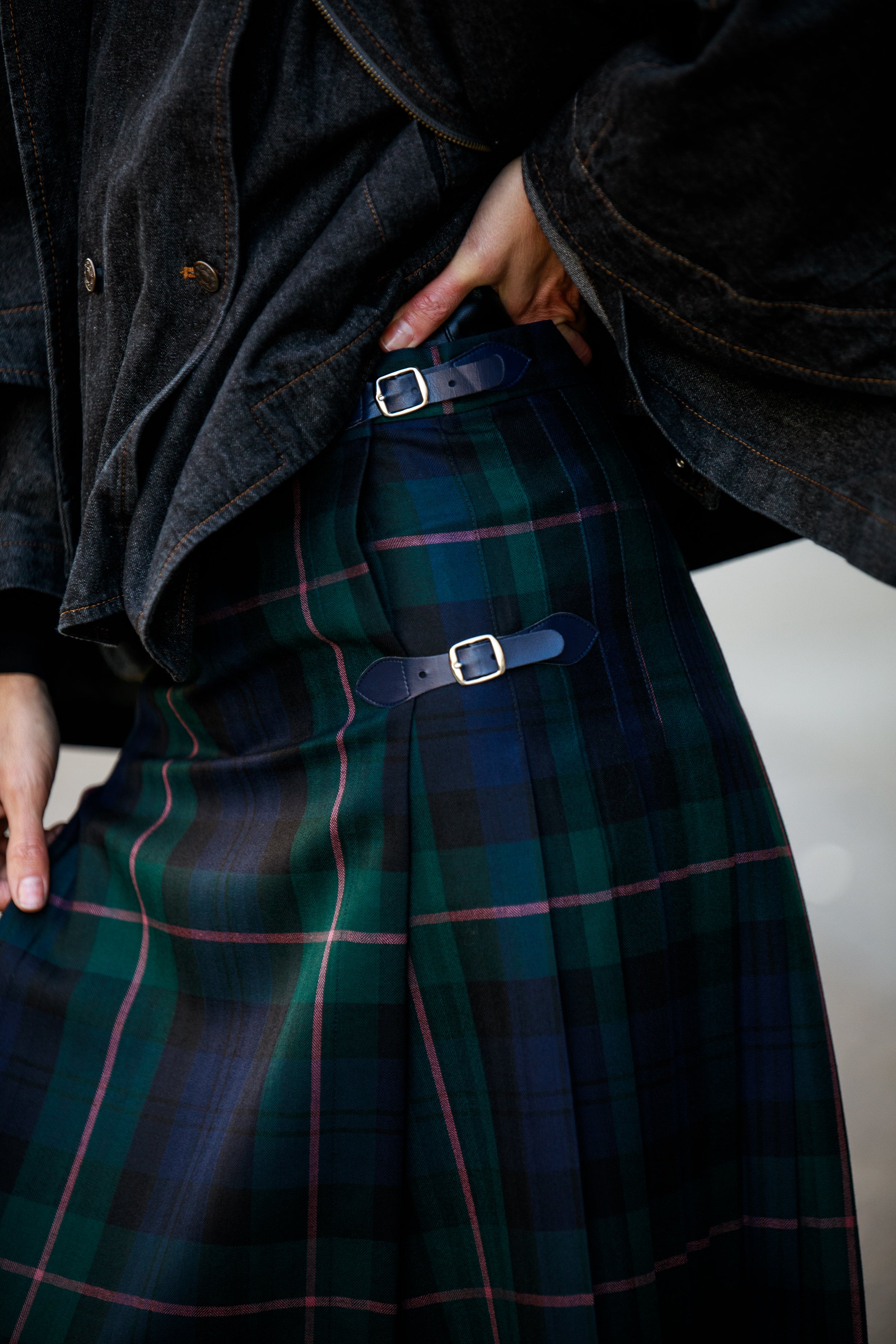 Plisy typu knife pleat podkreślają ciągłość wzoru tartanu i kunszt krawiecki, zachowując elegancję i funkcjonalność.