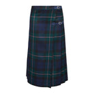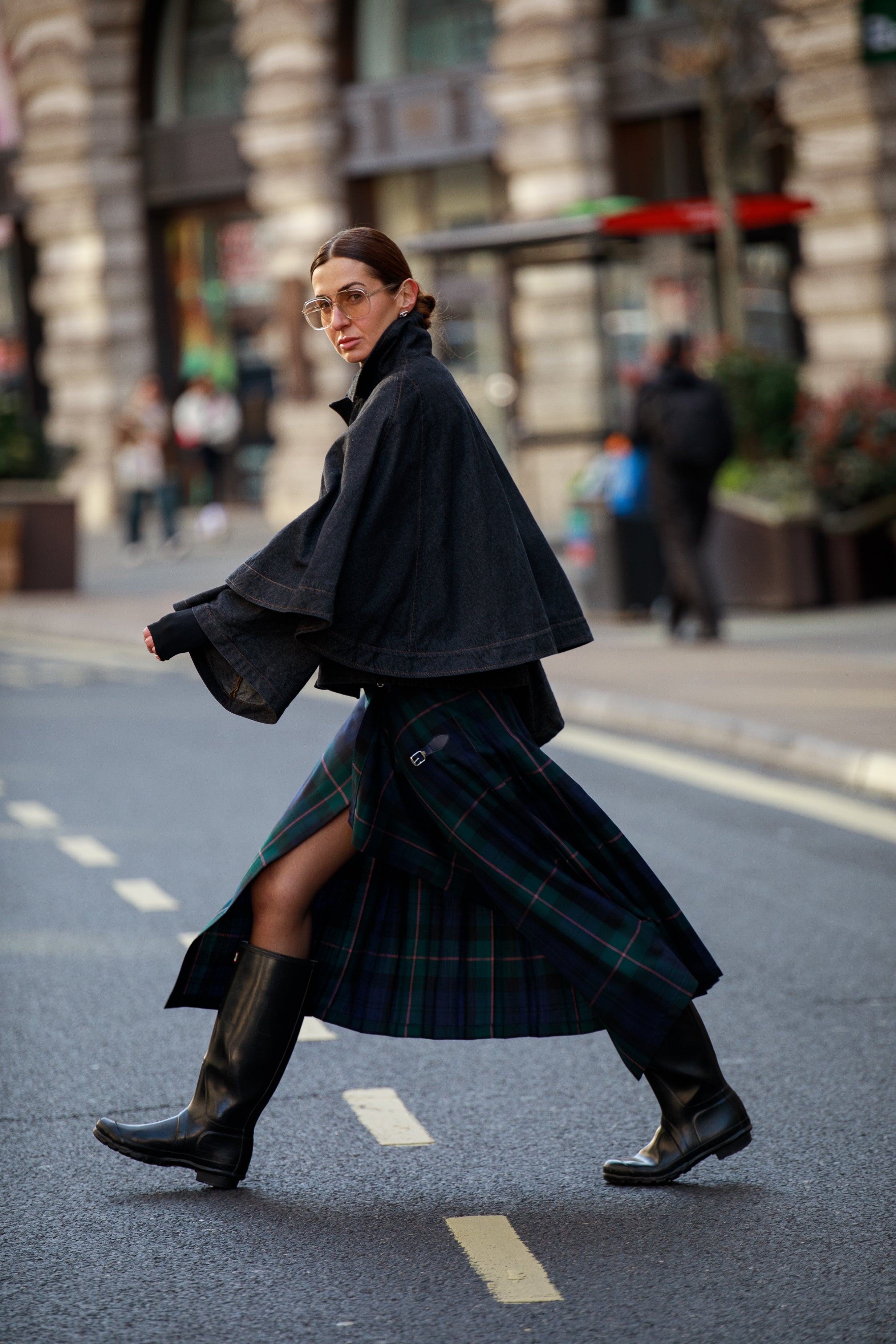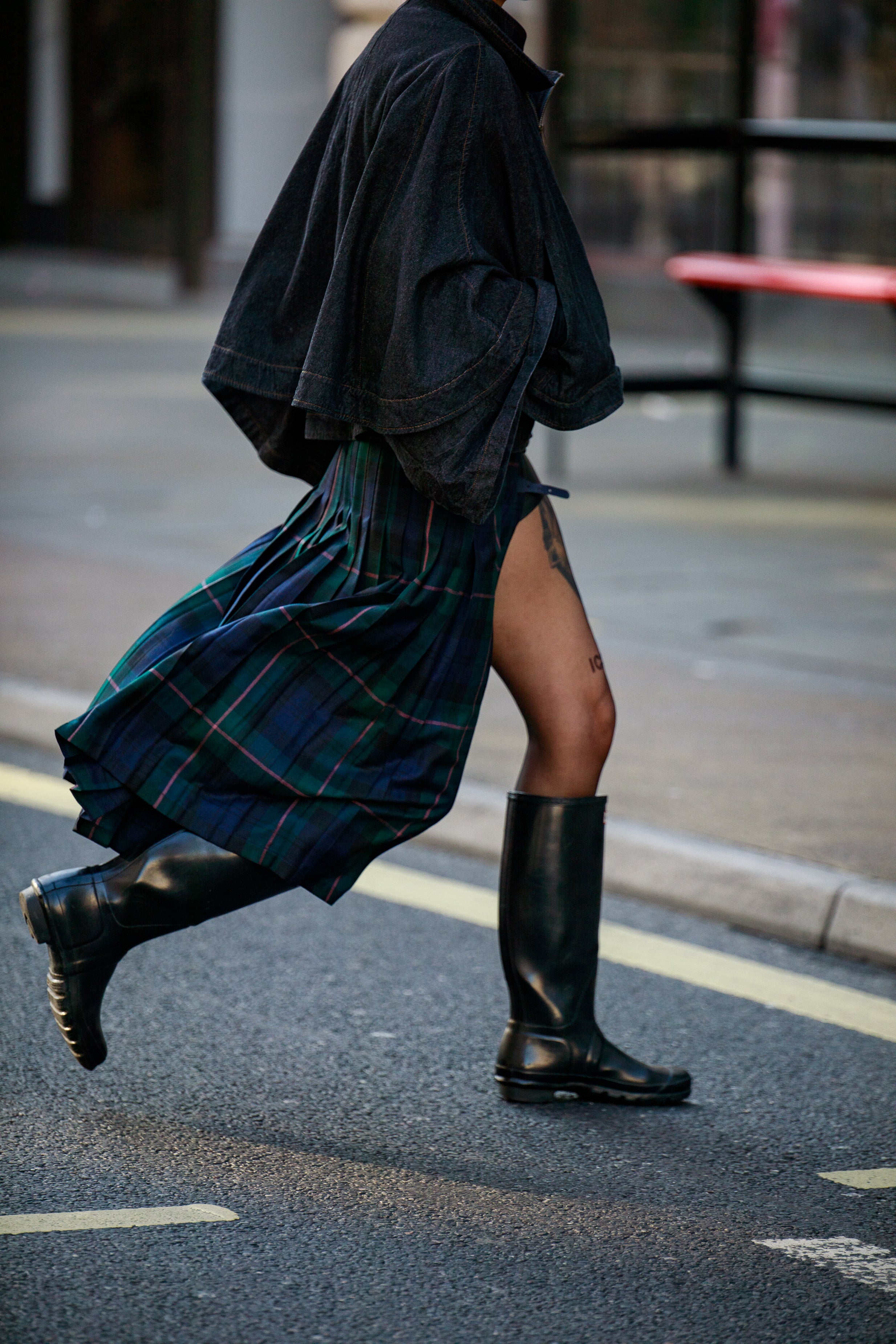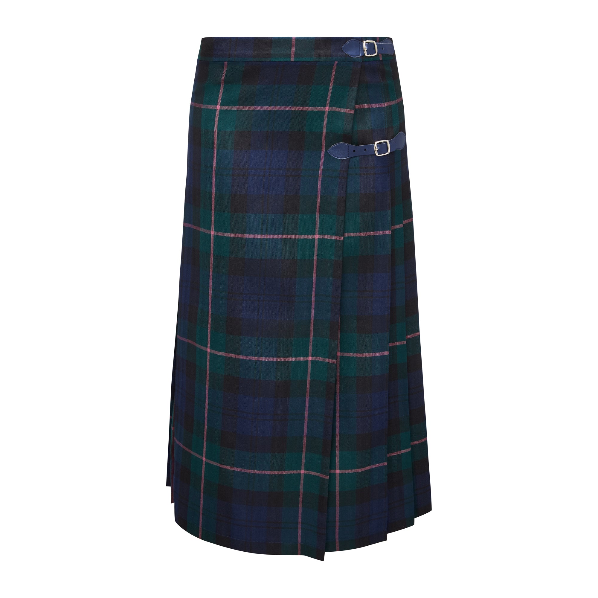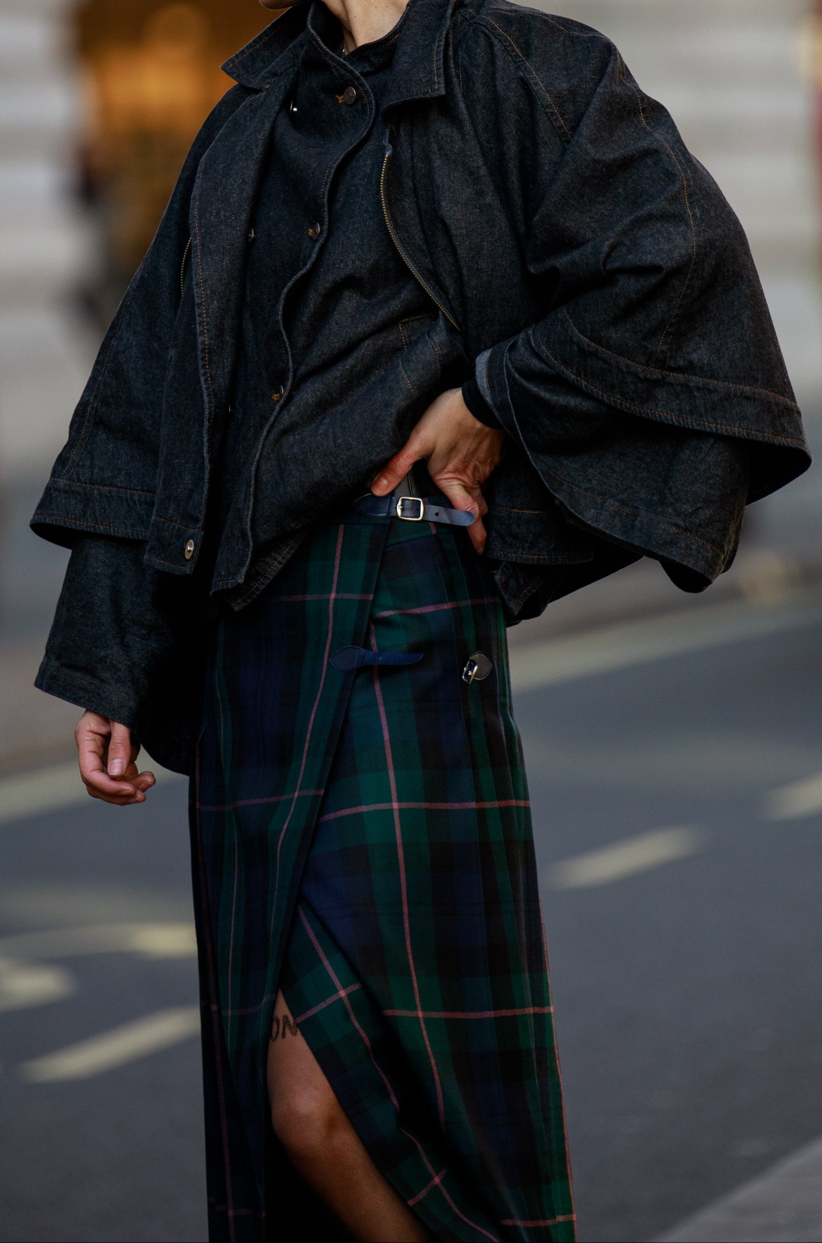 Plisy typu knife pleat podkreślają ciągłość wzoru tartanu i kunszt krawiecki, zachowując elegancję i funkcjonalność.