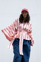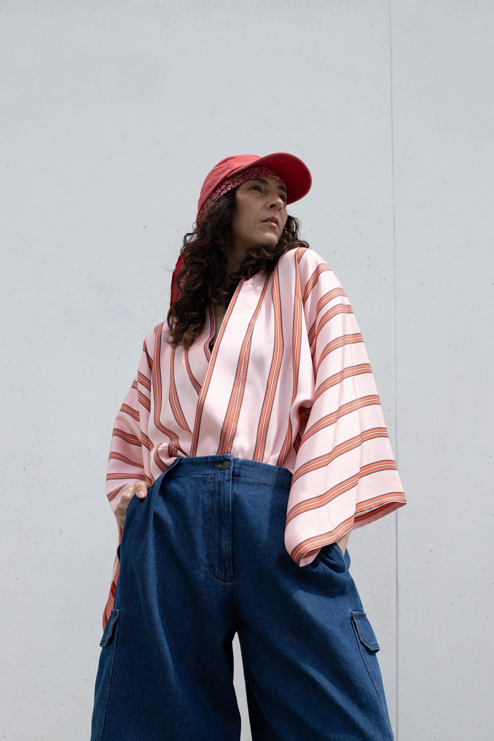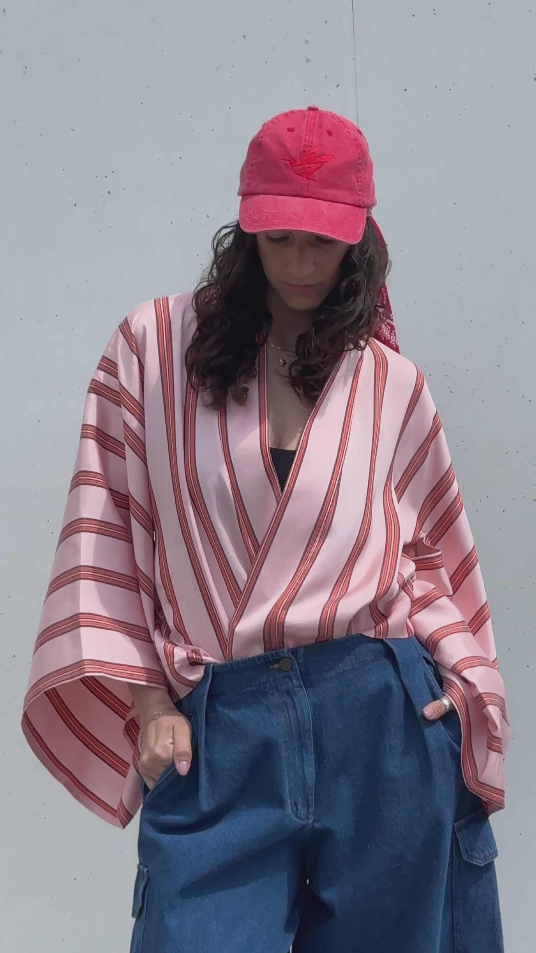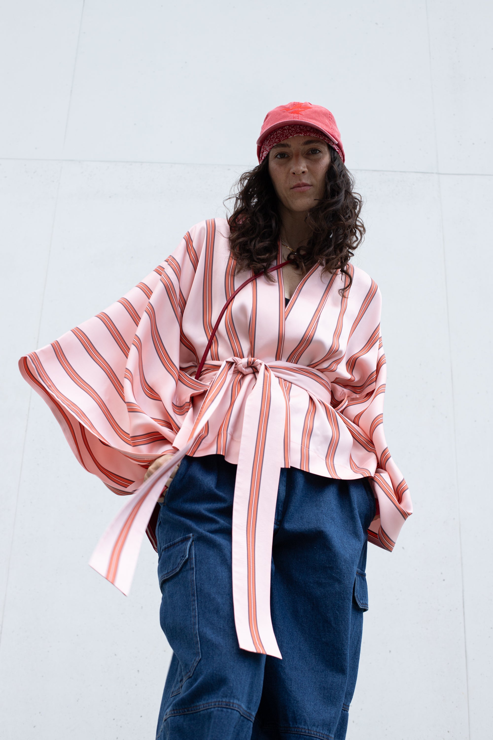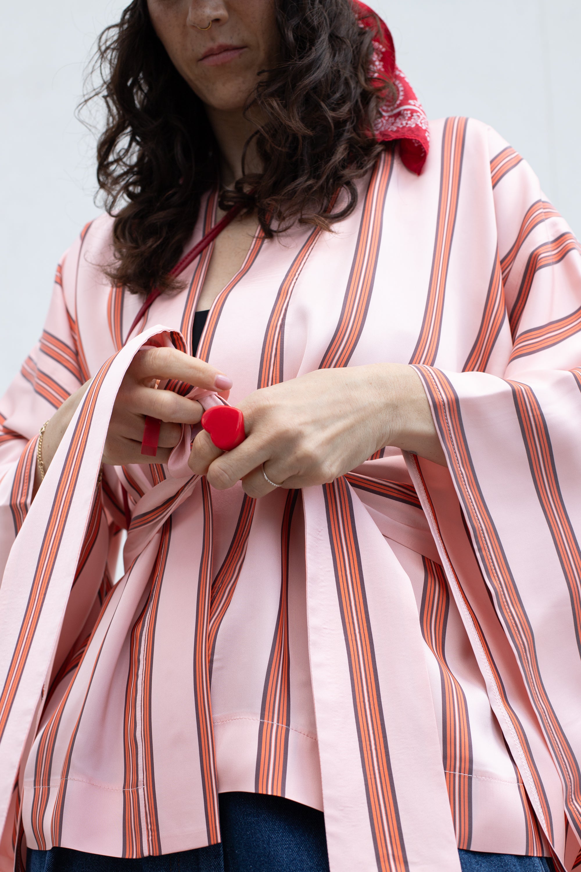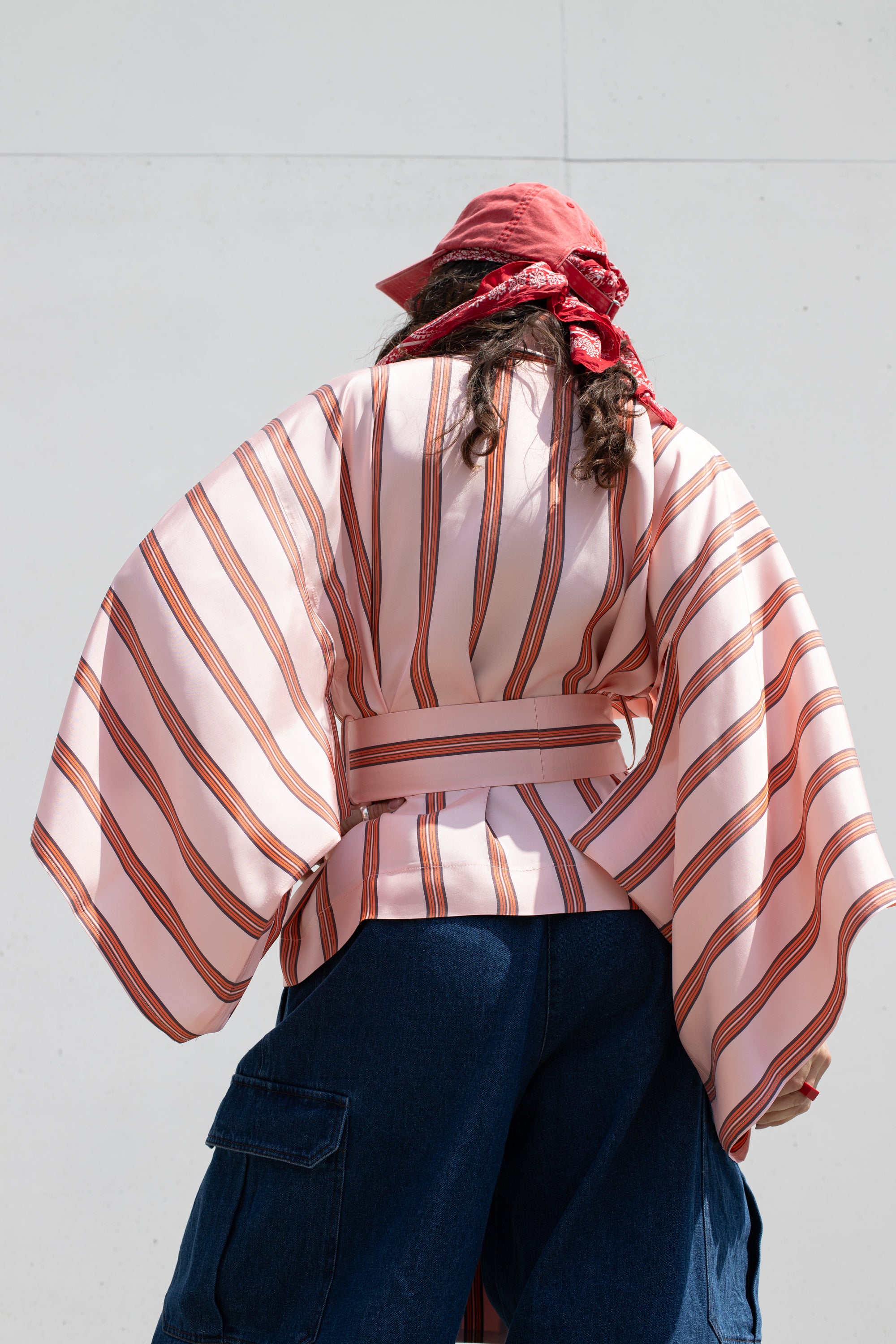 Absolutnie ponadczasowy krój japońskiego haori uzupełniony o szlufki i szerszy pas.